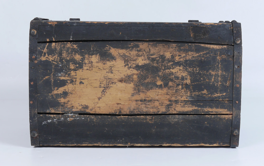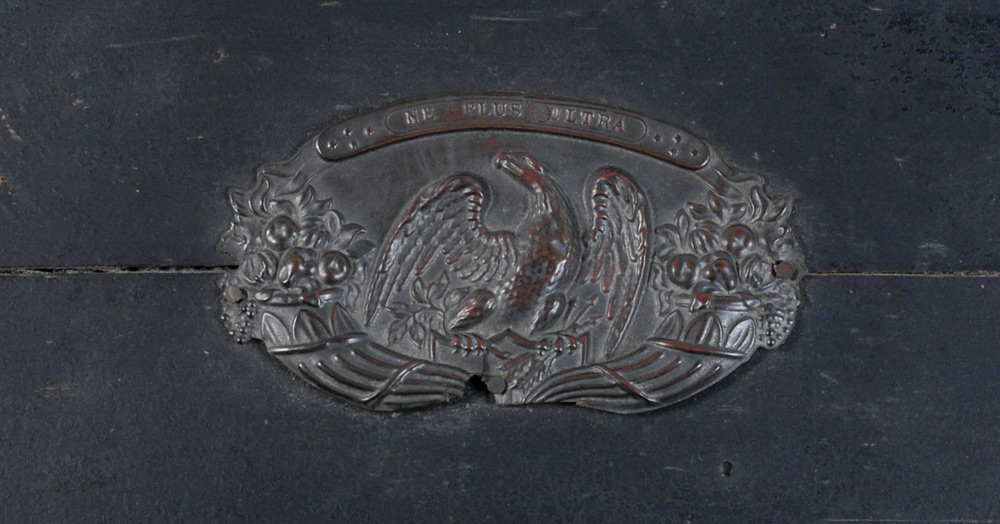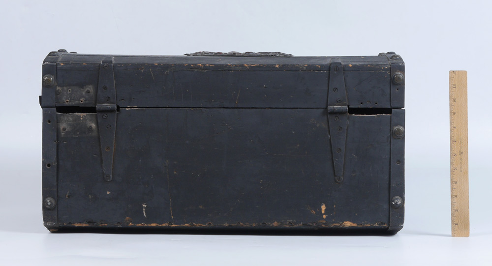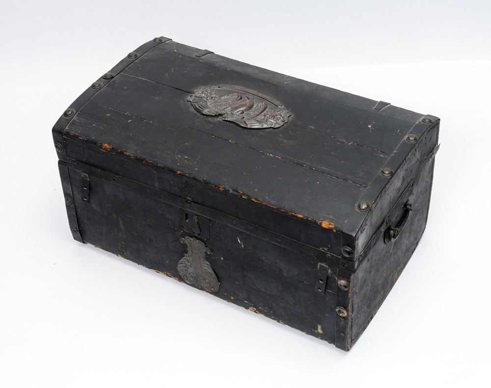 CIVIL WAR ERA SAILORS TRUNK: Black painted with iron hardware, hinged domed lid, embossed brass plaques, top plaque with eagle and motto, front plaque with foliate scroll. Overall measures 14'' x 27 1/2'' x 16 1/4''.