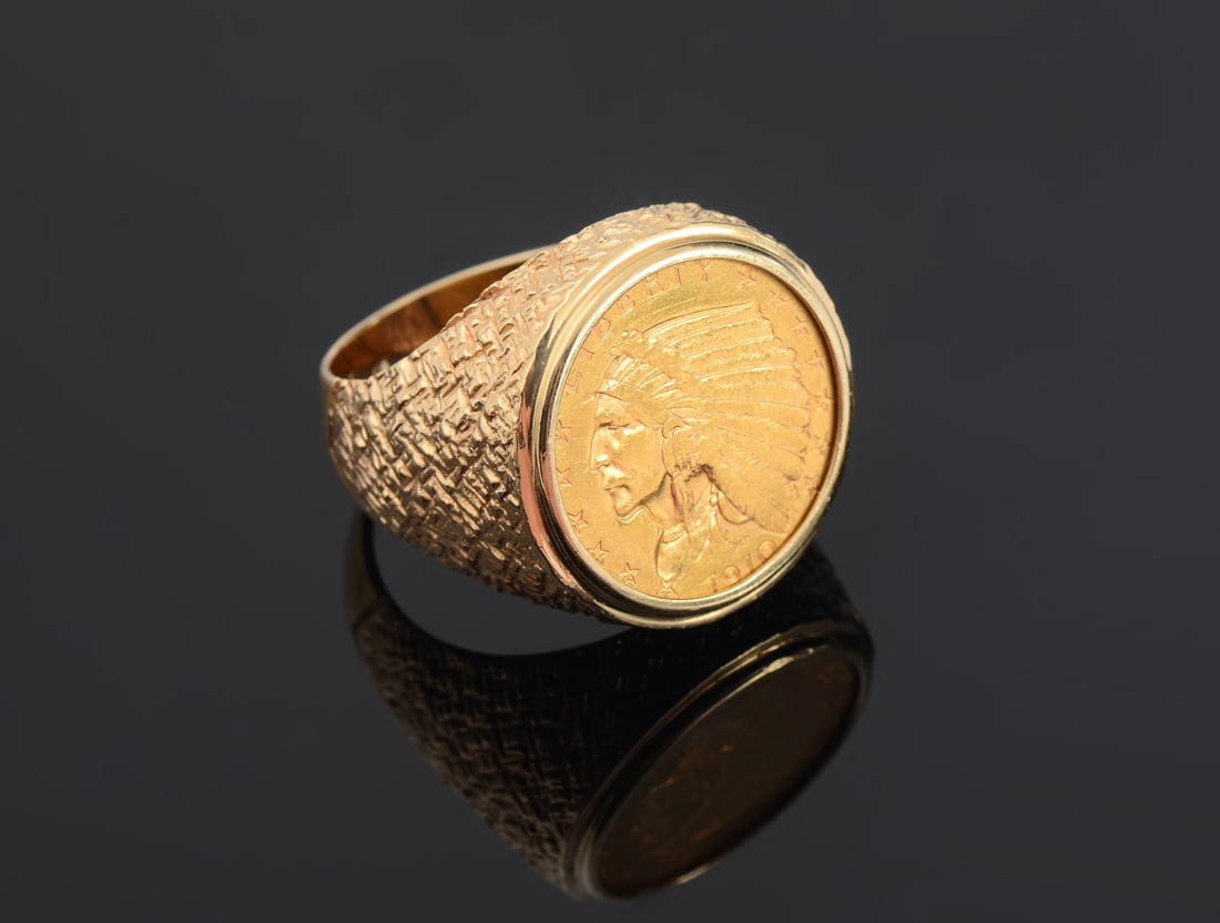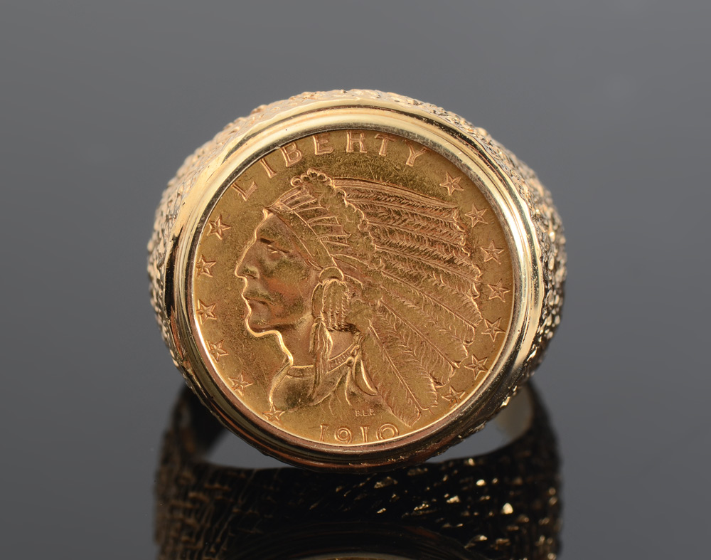1910 QUARTER EAGLE US COIN RING: 14K yellow gold ring contains one 1910 Indian Head/Quarter Eagle US coin. Size 9. 14K Gold weight: 9.0 grams.