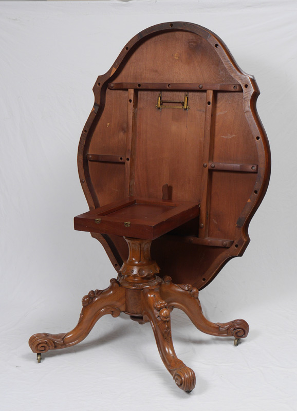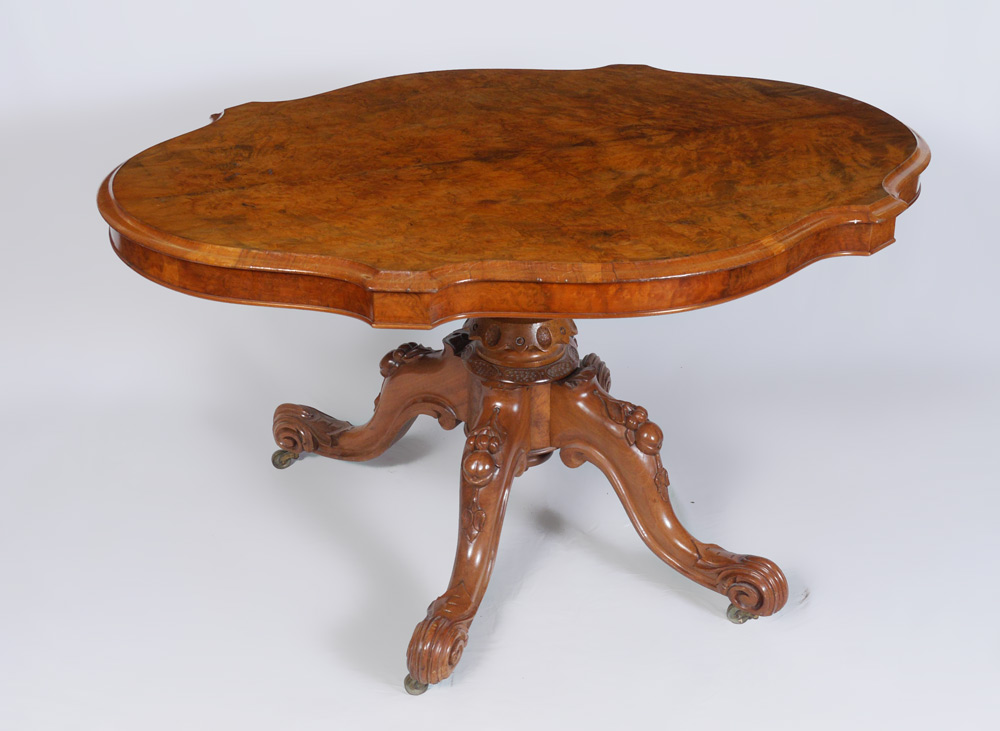 BURL WOOD LOO TILT TOP TABLE: Turtle top loo or breakfast table with burl wood veneer, pedestal base with carved and shaped splayed legs ending in castors. Overall measures 29'' h. x 56 1/2'' x 43''.