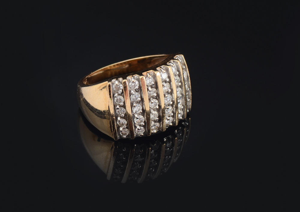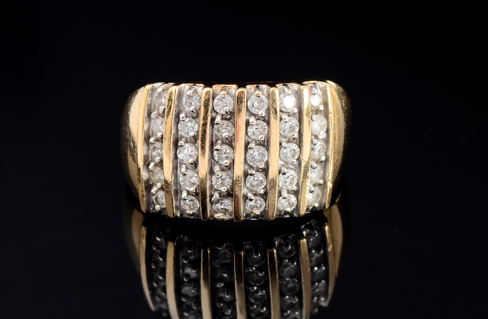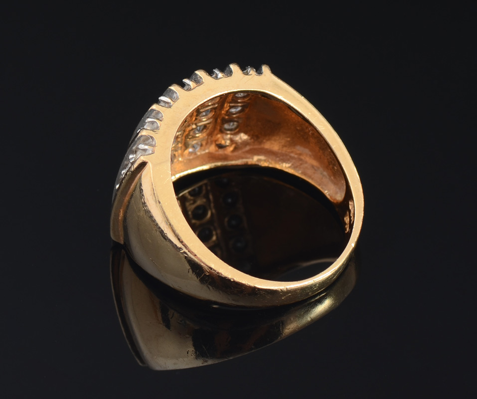 DIAMOND COCKTAIL RING: 14K yellow gold ring contains 30 round brilliant cut diamonds totaling approx. 1.00 Ct., rated SI in clarity and H-I in color. The diamonds are prong set. Weight: 7.8 grams. Size: 8.5