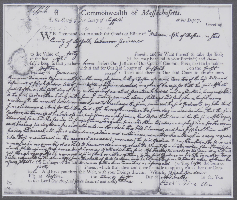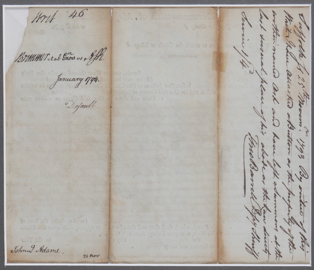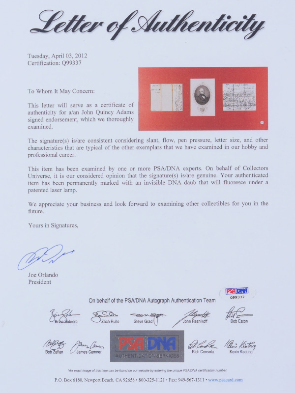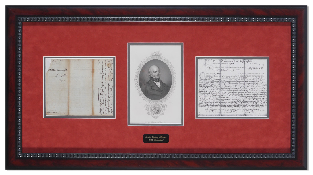 1793 JOHN QUINCY ADAMS SIGNED DOCUMENT: 1793 Massachusetts warrant for $40, signed on the back ''John Q Adams'', and dated Nov. 25th. Nice early example of Adams signature before he entered politics. Framed and matted with photocopy of warrant and steel engraving in presentation and sold with a Letter of Authenticity from PSA/DNA dated April 2012. Frame measures 35 3/4'' x 19 3/4''.