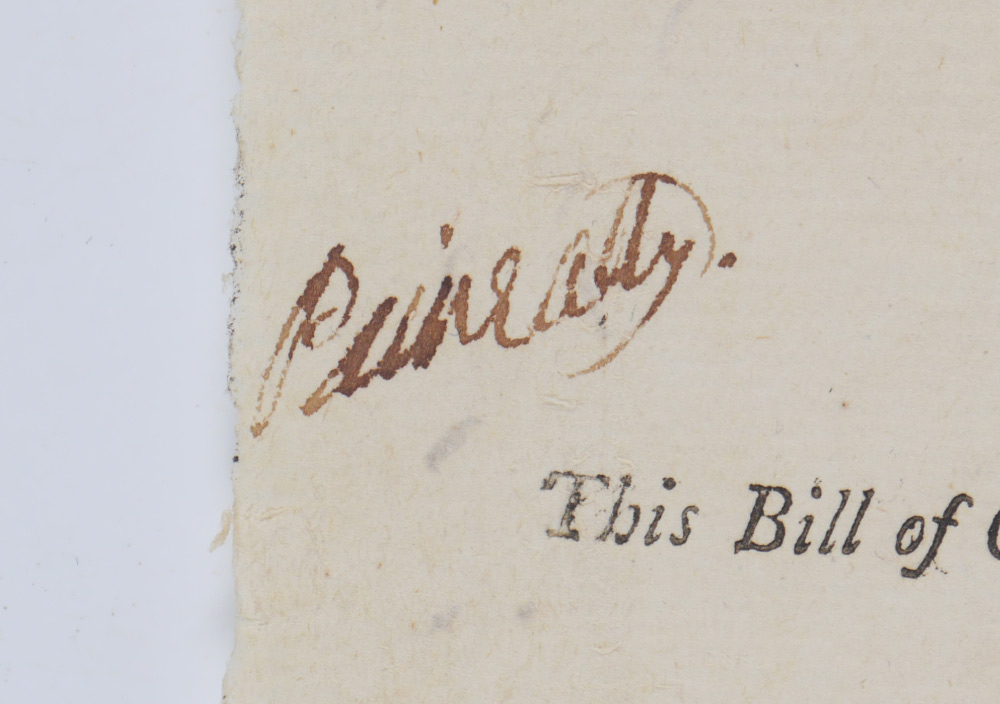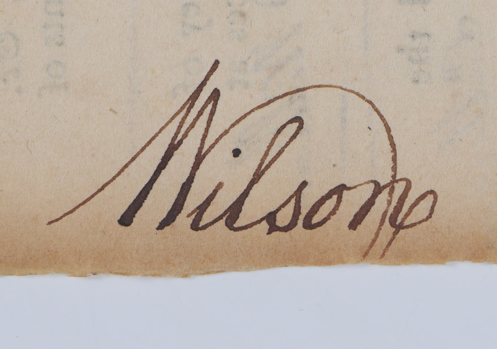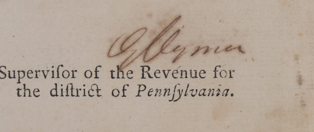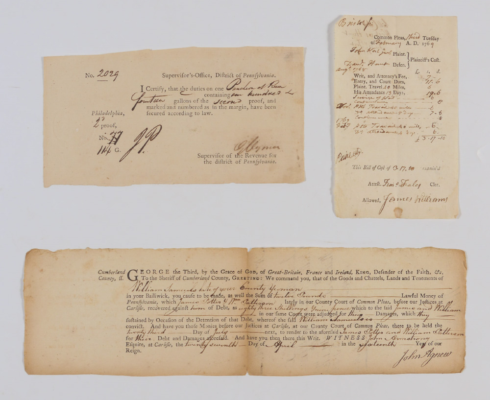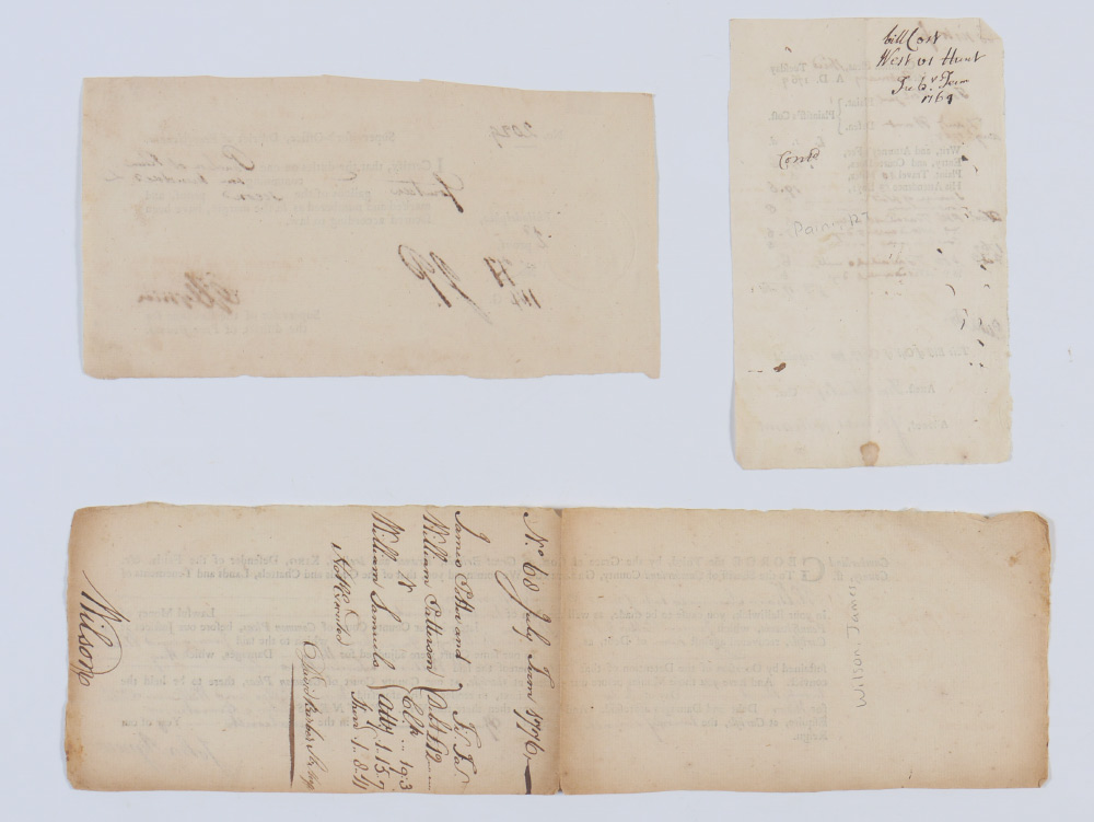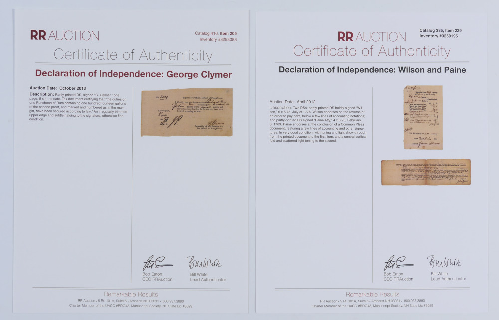 3 PIECE SIGNERS OF THE DECLARATION OF INDEPENDENCE AUTOGRAPHS: 3 pieces total to include 1) George Clymer signed Pennsylvania document, undated, 4 1/4'' x 8''. 2) James Wilson signed on back of order to pay a debt, dated July 1776. 3) Robert Treat Payne signed Common Pleas document, dated February 1769. All 3 with certificates of authenticity from RR Auctions.