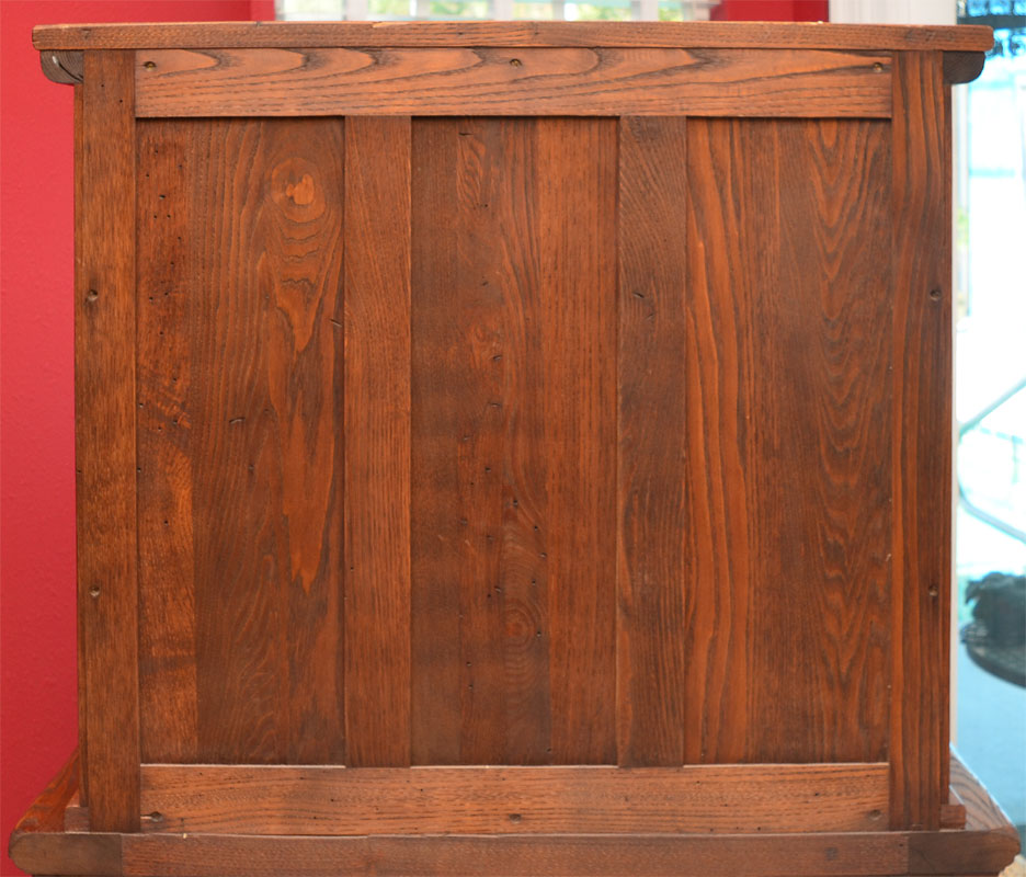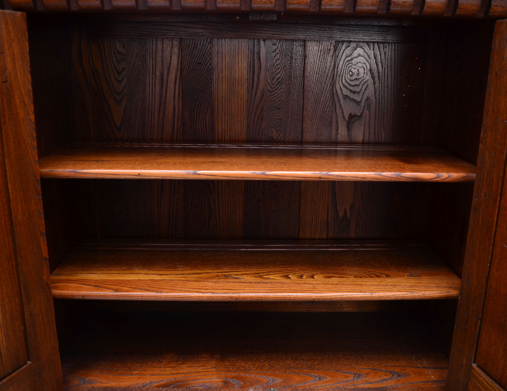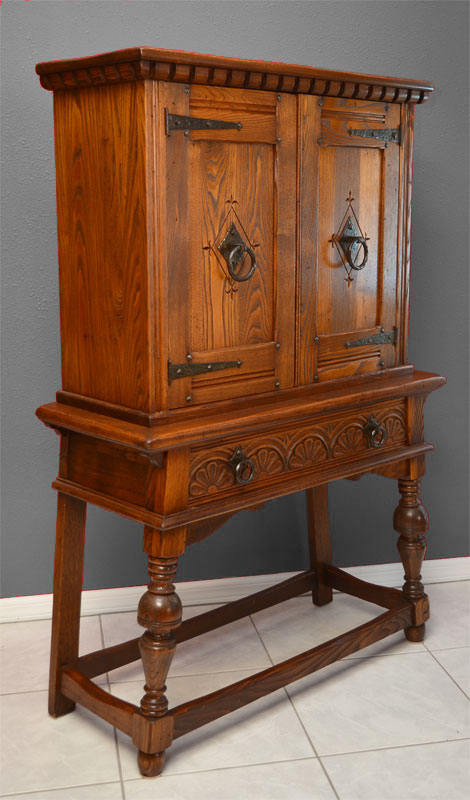 ENGLISH OAK BLIND CHINA CABINET: Dentil molding over 2 carved doors with iron hardware and tacks, 2 interior shelves. Single full length drawer with carved shell decoration over turned front legs, overall 60 1/4'' h. x 39 1/2'' x 16 1/2''.