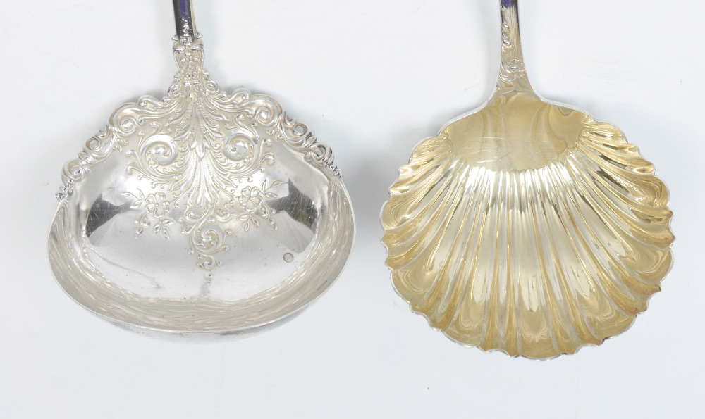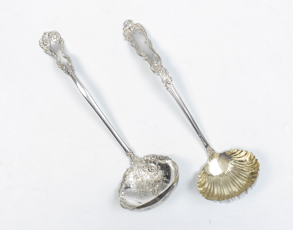 2 STERLING SILVER LADLES: 2 pieces total to include 1) Frank Smith ''Baronial'' pattern with ribbed bowl, 11 3/4'' long. 2) Illegible mark (Towle?) with embossed bowl, 12'' long. Approx. 12 troy oz.