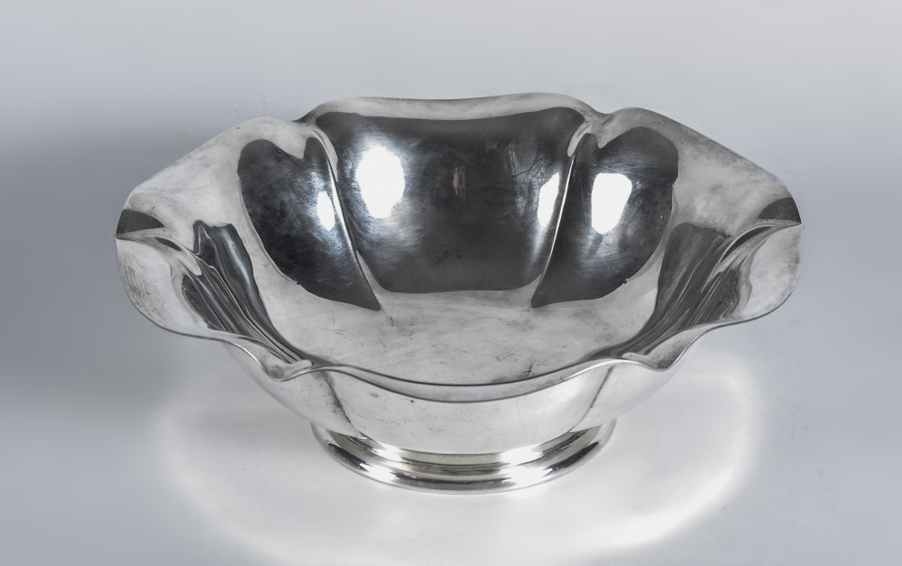 DOMINICK & HAFF SALEM STERLING CENTER BOWL: Footed floriform bowl, marked with Dominick & Haff mark,Sterling, x1220/105, Salem, 10 in., bugle date mark. Overall 3 1/4'' h. x 9 3/4''.