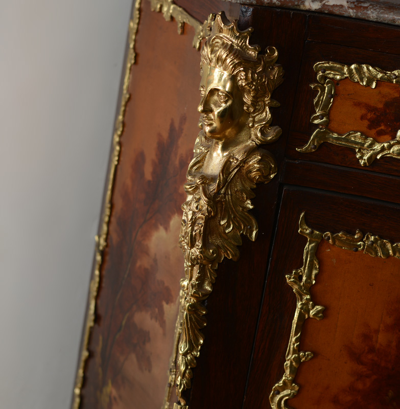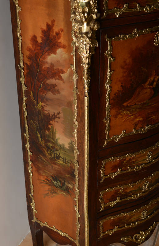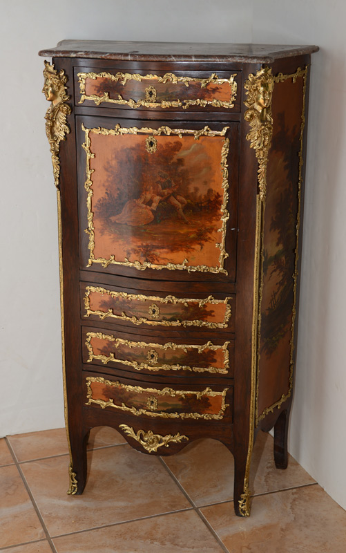 FRENCH STYLE ORMOLU MOUNTED CABINET: Shaped marble top, 4 drawers with central door each with paint decorated panels framed in foliate ormolu mounts. Cast ormolu figural female busts at corners, shaped sides with matching decoration. Overall measures 54 3/4'' h. x 31 1 /2'' x 15 1/4''.