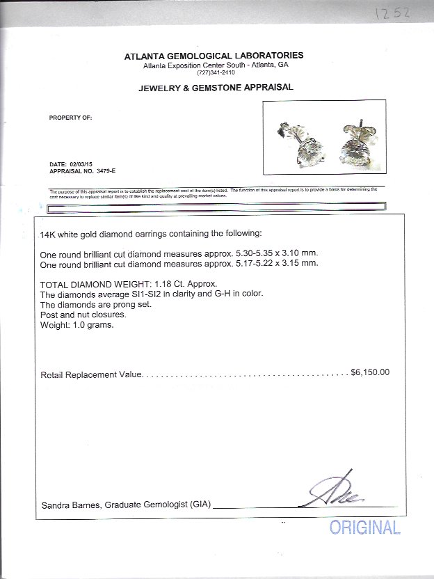 1.18 CT DIAMOND STUD EARRINGS: 14k white gold Martini setting. Diamonds are rated SI-SI2 color and GH color. Sold with current Atlanta Gemological GIA graduate's appraisal for $6,150.