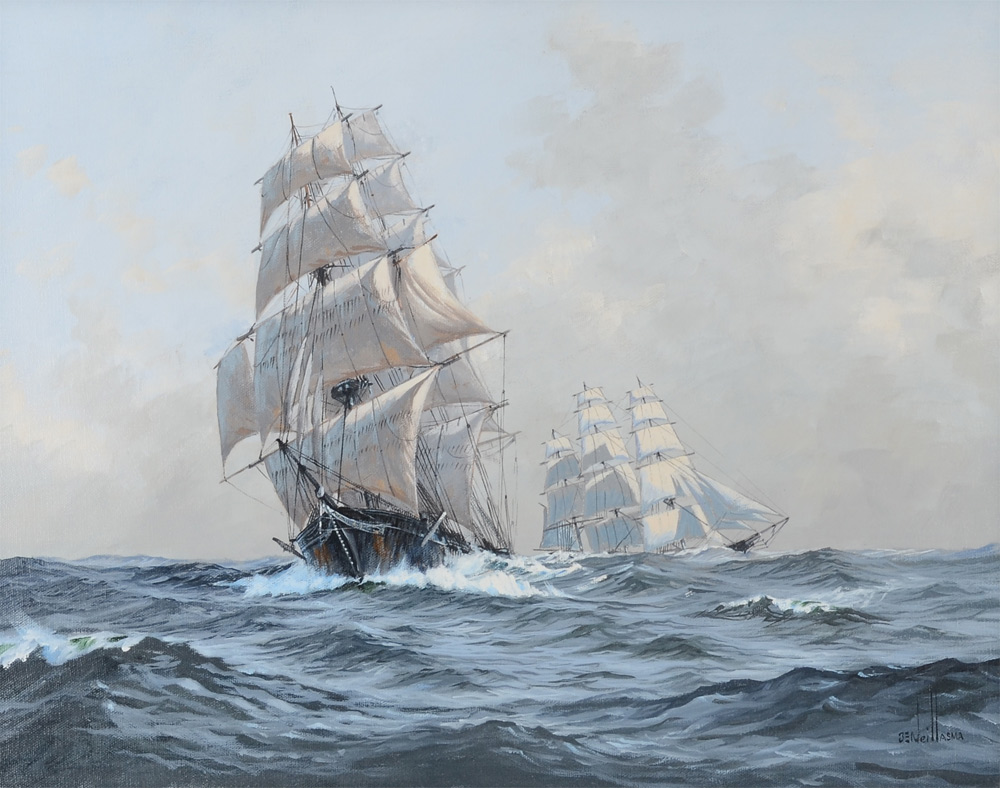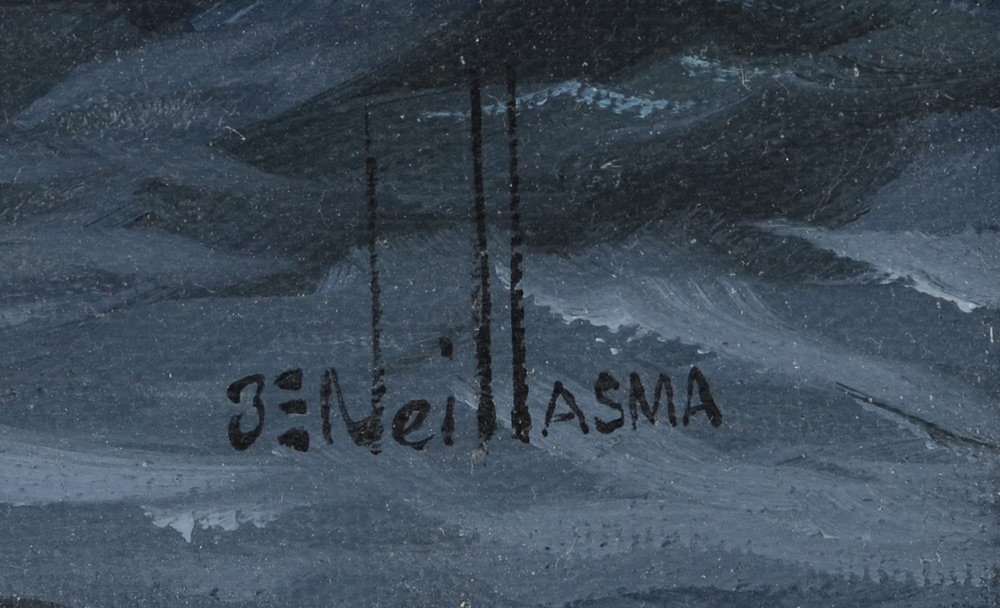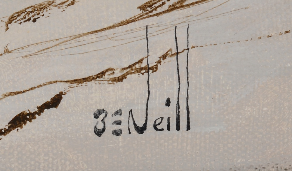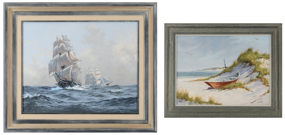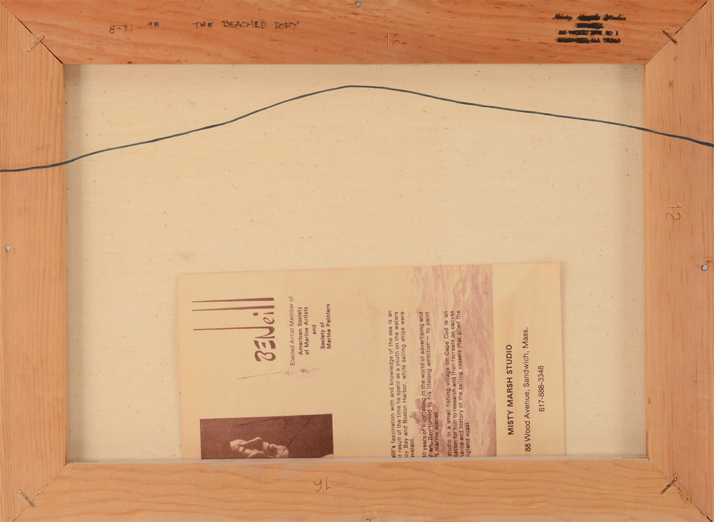 NEIL, Ben, (American, 20th C.): 2 piece art lot to include, 1) Clipper ships at high sea, Oil/Canvas, 16'' x 20'', signed lower right ASMA, framed, 22'' x 26''; 2) Beached Dory, Oil/Canvas, 12'' x 16'', signed lower right, framed, 16'' x 20''.