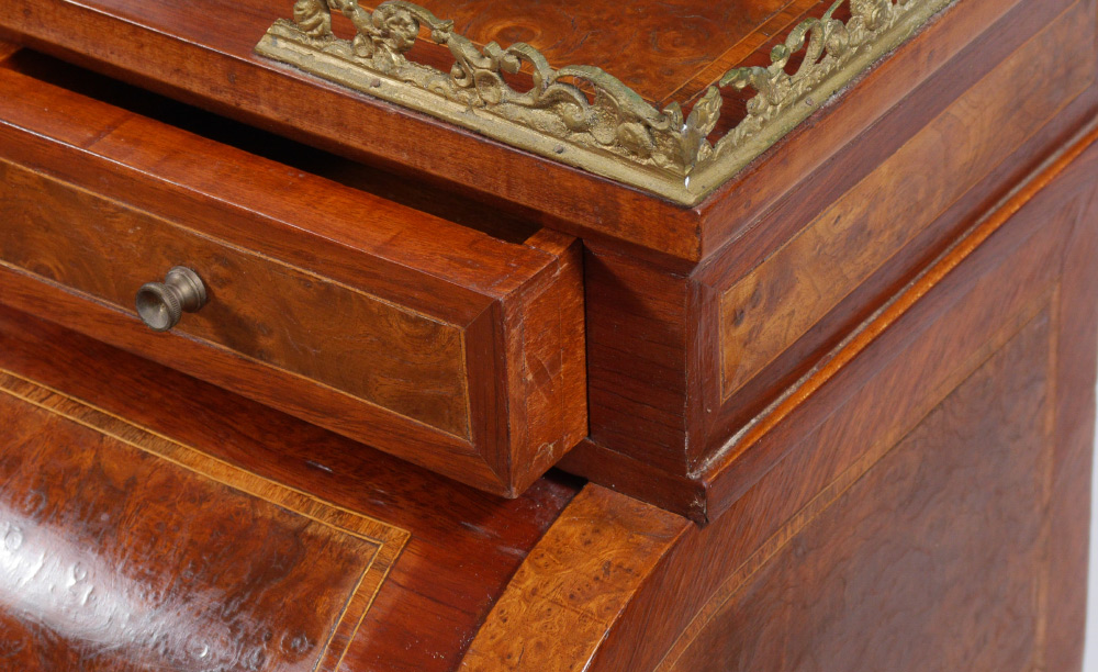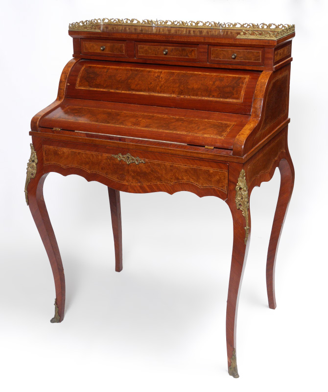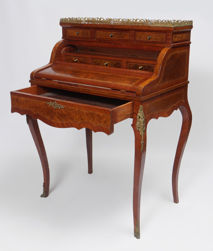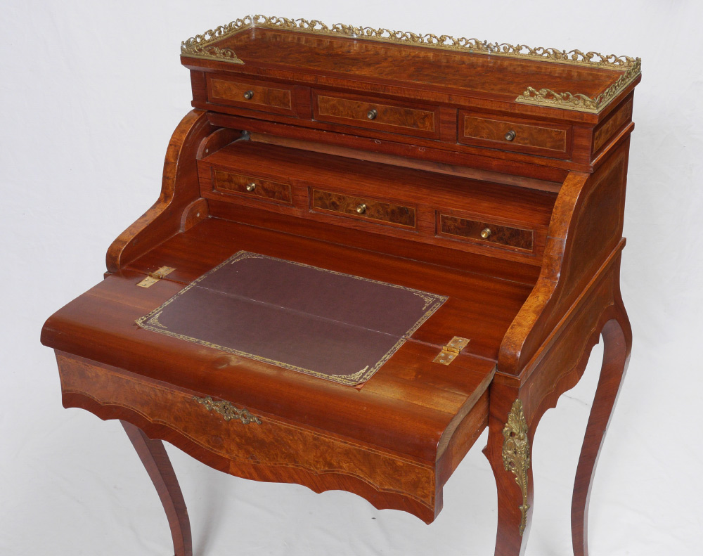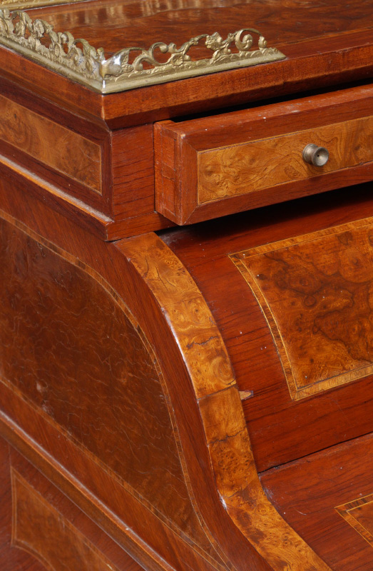 INLAID LADIES MECHANICAL WRITING DESK: Top with openwork gilt metal gallery over 3 drawers, over round full length door which opens mechanically when lower drawer is opened. 3 internal drawer, shaped fall front opens to inset embossed leather writing surface. Shaped legs with applied decoration. Burl veneer and string inlay all over. Overall 42'' h. x 31 1/2'' x 21 1/2''.