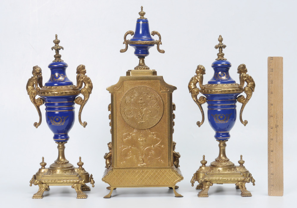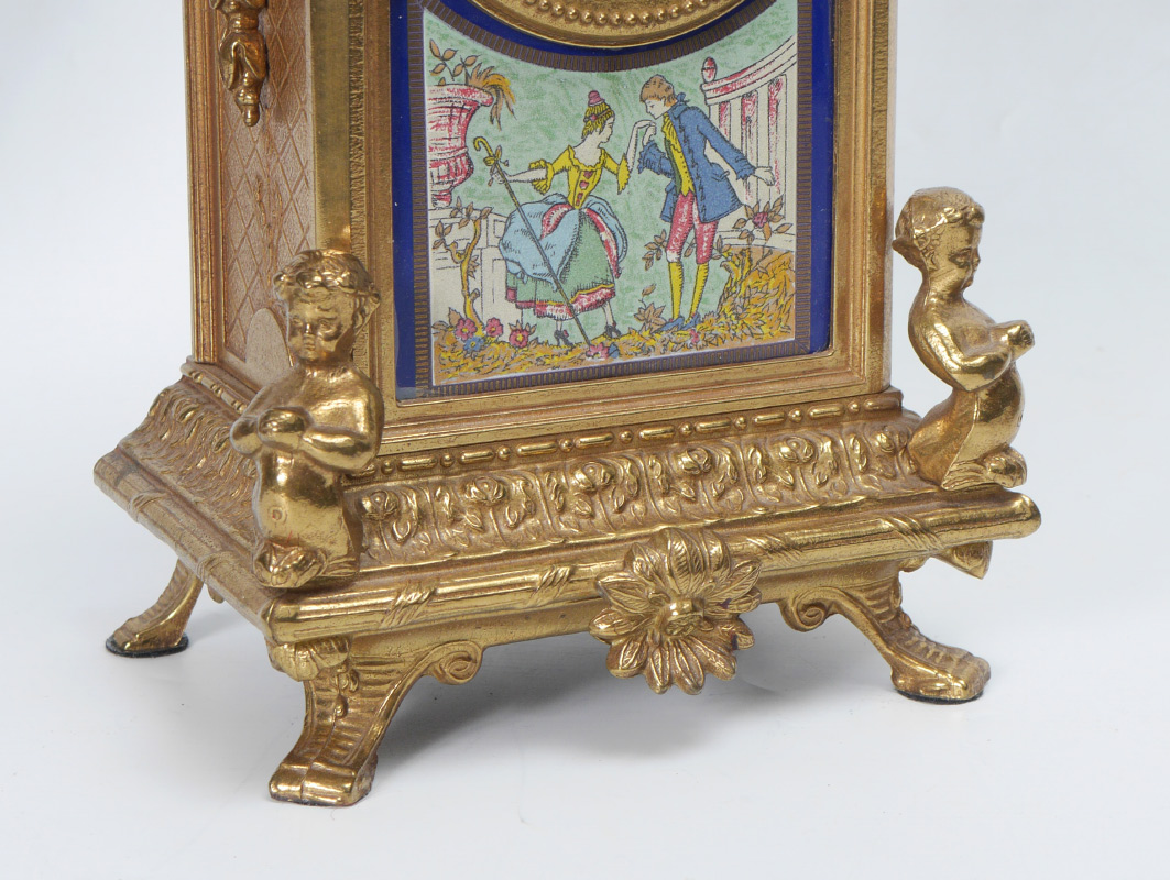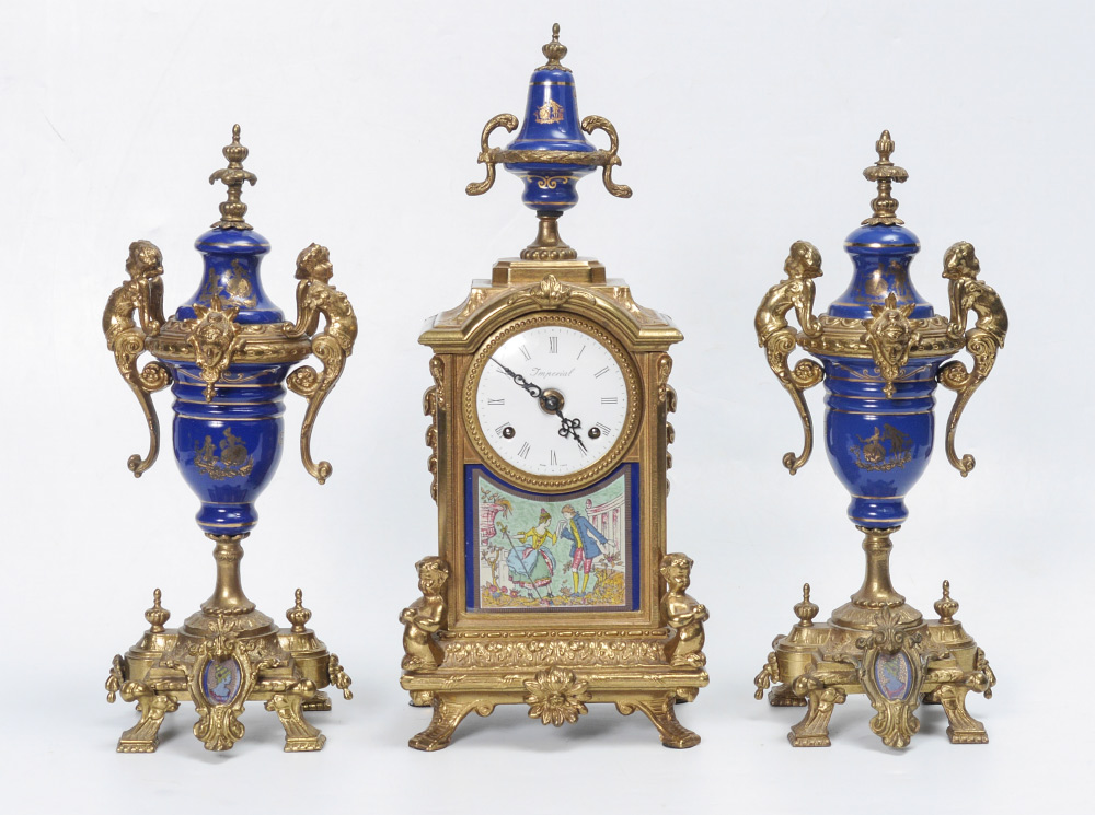 3 PIECE IMPERIAL CLOCK GARNITURE SET: Contemporary set, clock with porcelain urn finial over gilt metal case, polychrome decorated insert, porcelain dial with roman numerals marked Imperial, Made in Italy. Key wind time and strike movement, 16 1/2'' h. x 7 1/4'' x 5''. Sold with matching garniture set with figural cherubs, 14'' h.