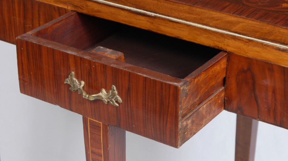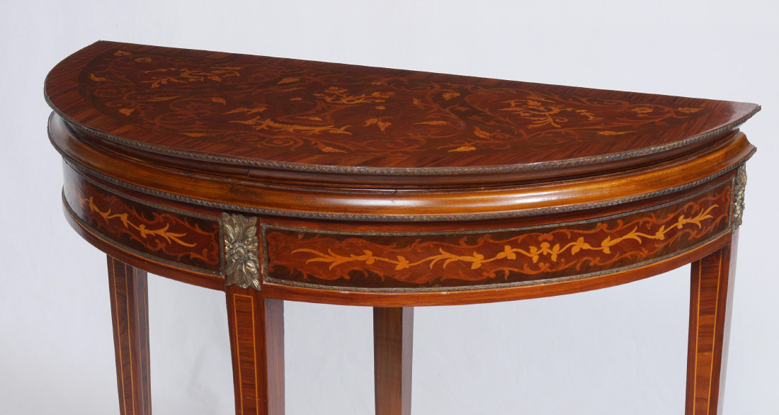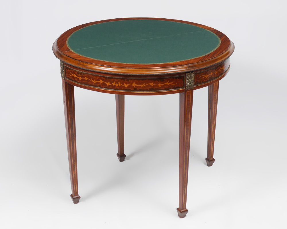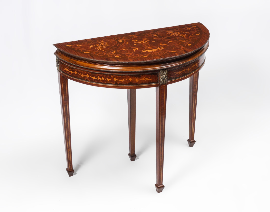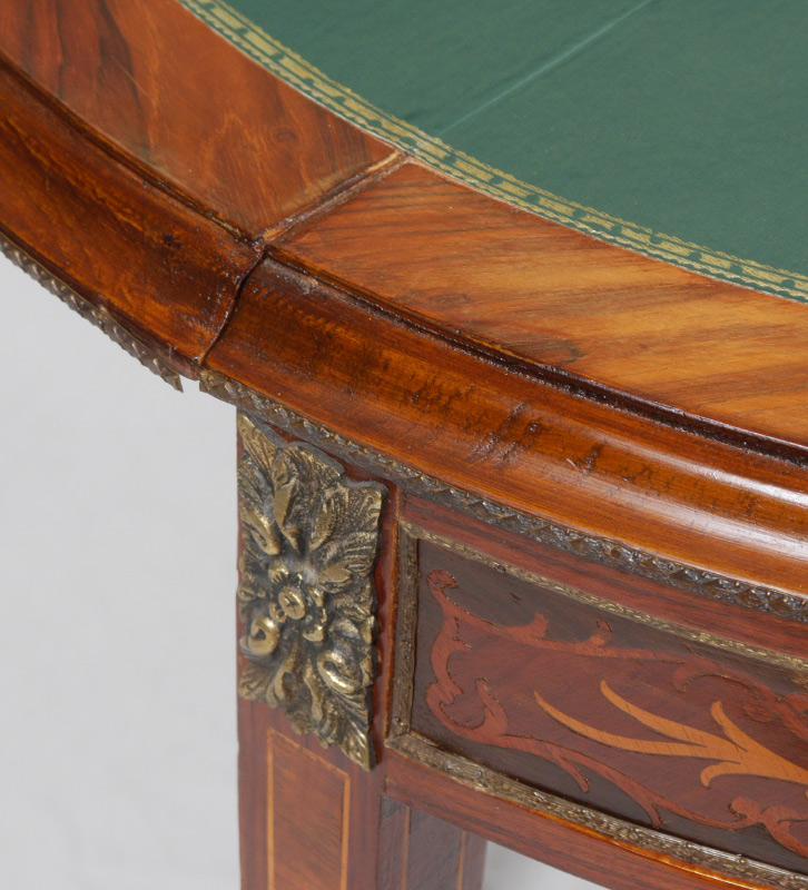 MARQUETRY INLAID GAME TABLE: Floral and foliate marquetry inlaid hinged top and skirt, string inlay tapered legs, applied decoration at joints, gilt metal trim. Drawer on back attached to leg to provide support for top when opened to reveal green leather playing surface. Closed measures 33'' h. x 35 3/4'' x 17 1/2''.