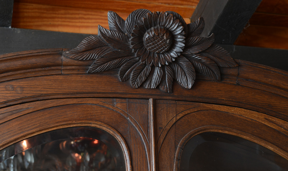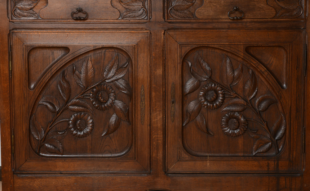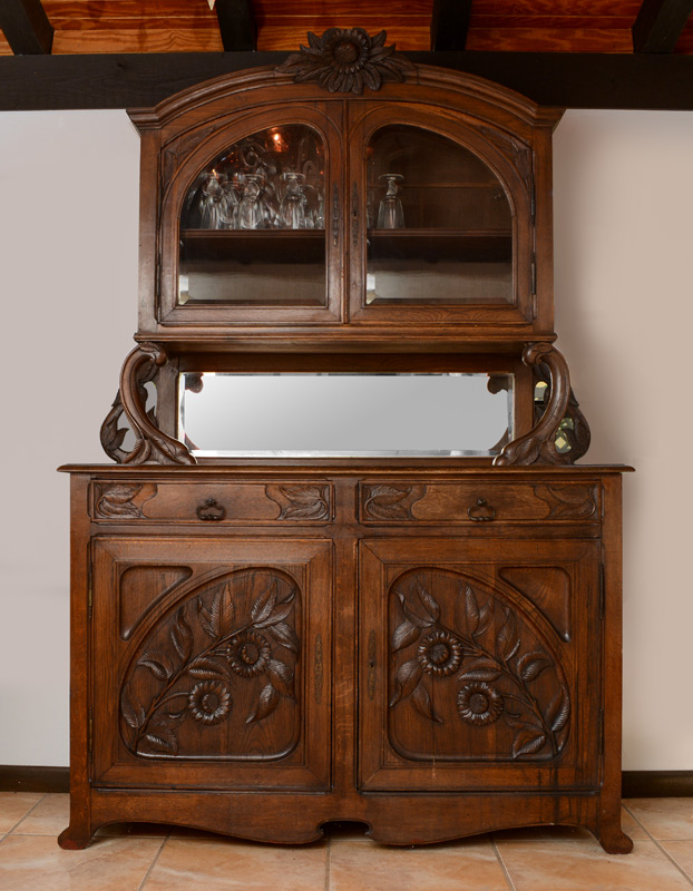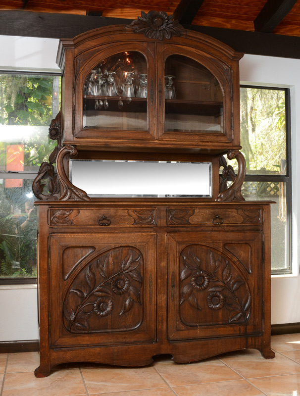 ART NOUVEAU CARVED SIDE BOARD / BACK BAR: Art Nouveau transitional style, shaped top with carved sunflower crest over 2 shaped beveled glass doors, single shelf, mirrored backsplash with carved floral decoration either side, unique shaped supports. Base with 2 drawers over 2 doors with floral and foliate carved panels, shaped skirt. Overall measures 91'' h. x 61 1/4'' x 23 1/2''. See matching buffet lot 1271.