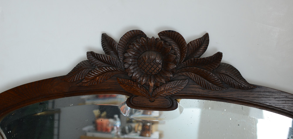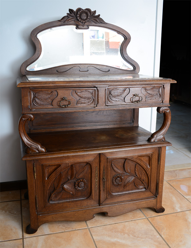 ART NOUVEAU CARVED MARBLE TOP BUFFET: Art Nouveau transitional style, shaped top mirror with carved sunflower crest, inset marble top over 2 drawers over open storage area, unique shaped supports. Base with 2 doors, single shelf with floral shelf paper. Doors and drawers with carved panels. Overall measures 59 3/4'' h. x 42'' x 19 3/4''. See matching sideboard lot 1267.