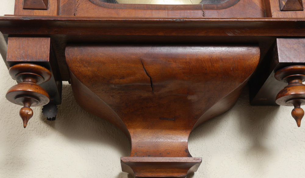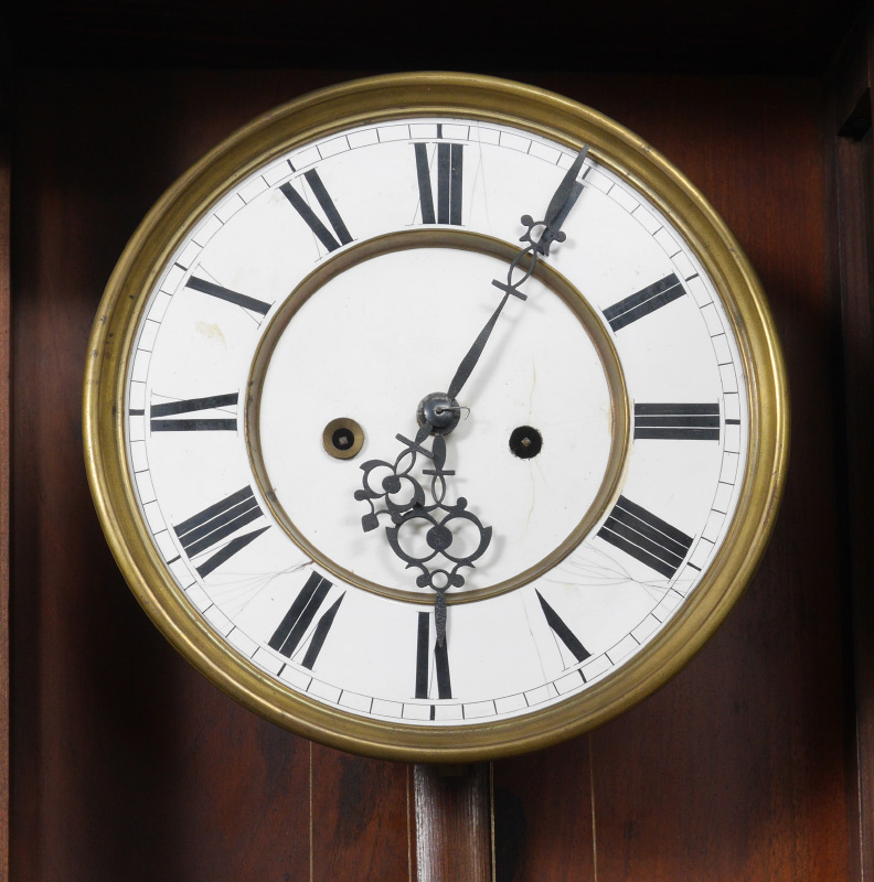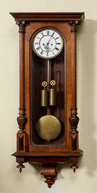 GERMAN DOUBLE WEIGHT REGULATOR WALL CLOCK: Walnut veneer case, door with carved and fluted half columns, lower urn finials. Porcelain dial with Roman numerals, double weight time and strike German movement. Overall measures 40 1/2'' h. x 16 3/4'' x 6 3/4''.