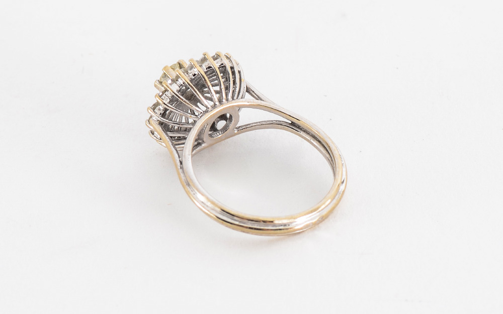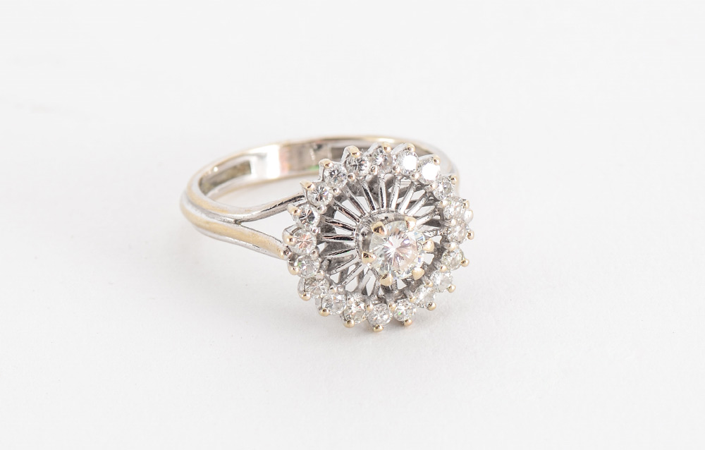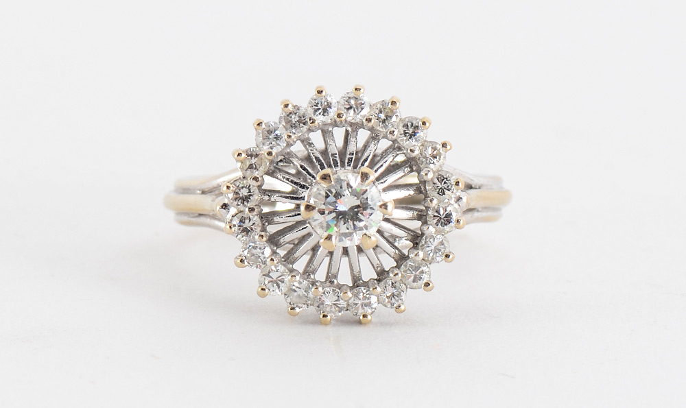 18K .75 CTW DIAMOND RING: 18K DIAMOND RING: Retro 18K white gold ring with 20 round brilliant cut diamonds circling the center diamond. Diamonds total approx. .75 Ct. The center diamond (.20 Ct.) is chipped. The diamonds average VS in clarity and G-H in color, all are prong set. Weight: 4.5 grams. Size: 7