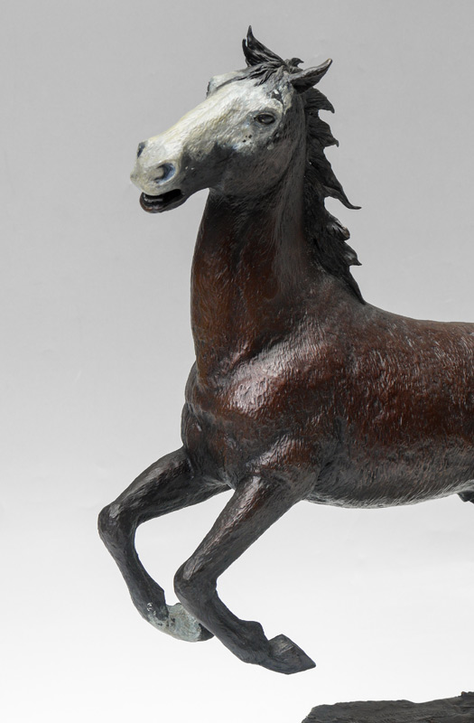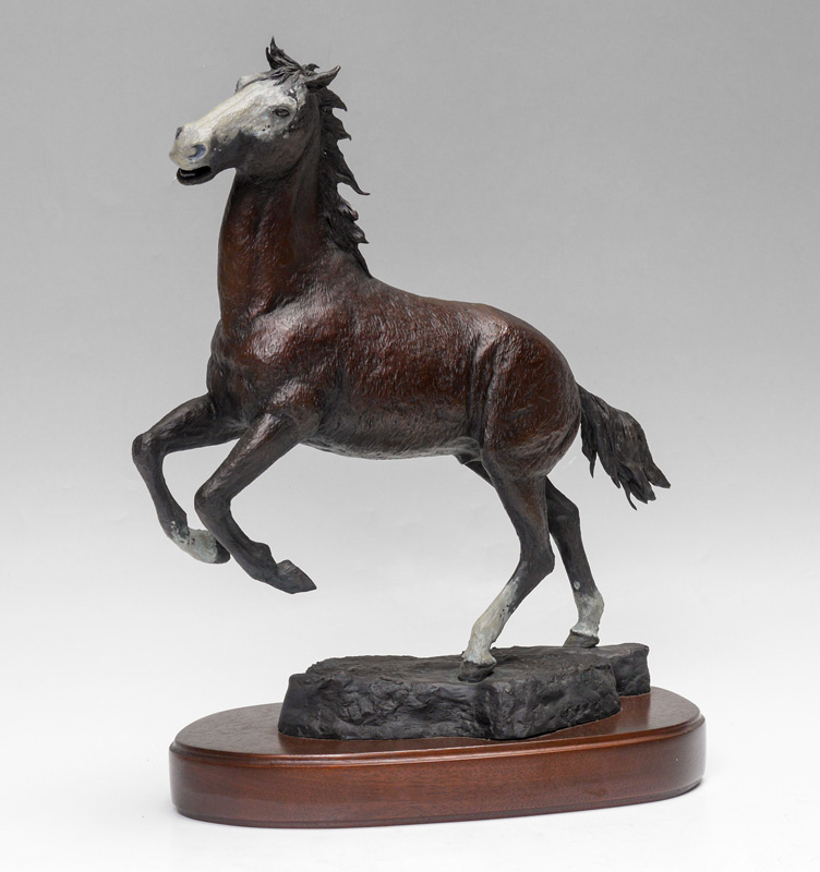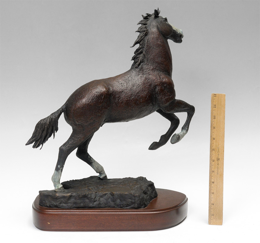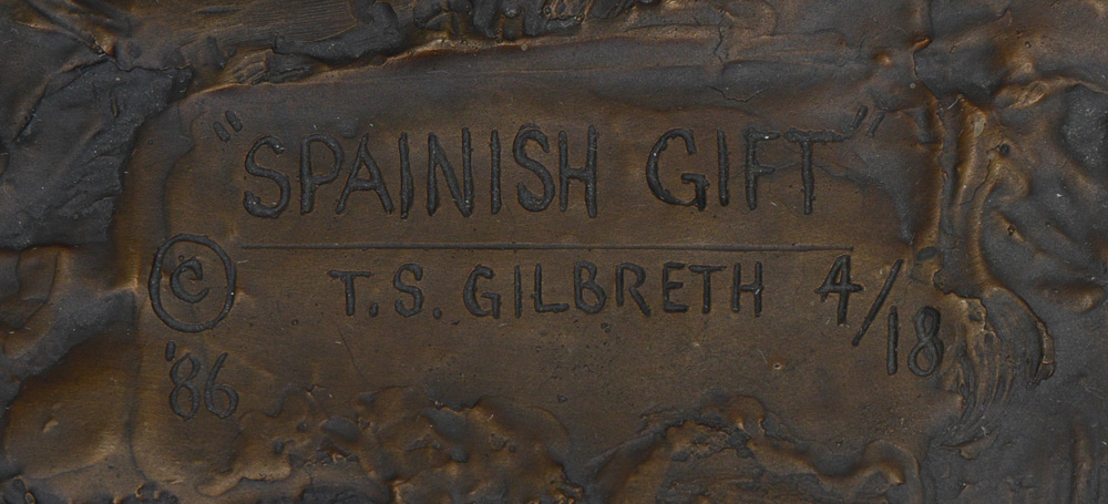 GILBRETH, T.S., (American, 1946- ): ''Spanish Gift'', Bronze, 17 1/4'' h. x 16 1/2'' w., incised signature along with incised title, #'d 4/18, dated '86, affixed to beveled wooden plinth, 20'' overall in height.