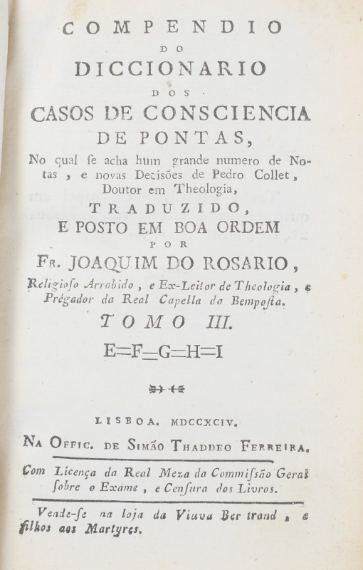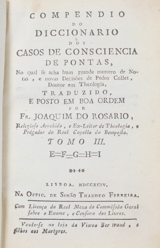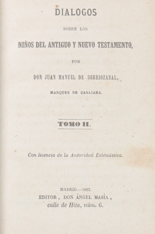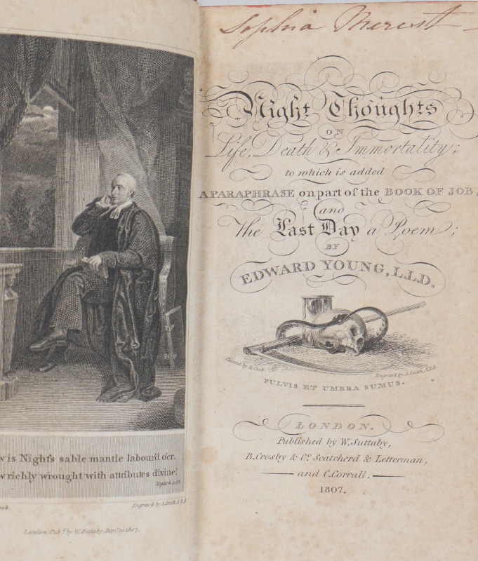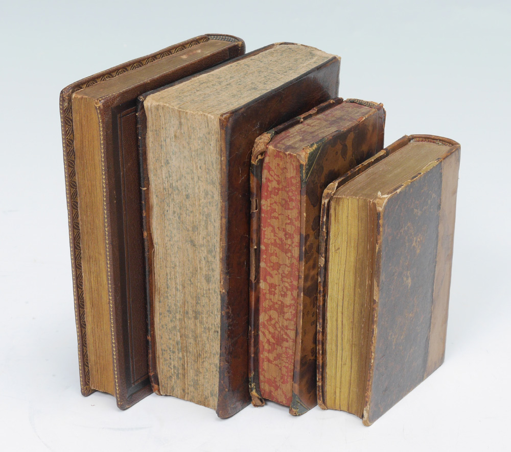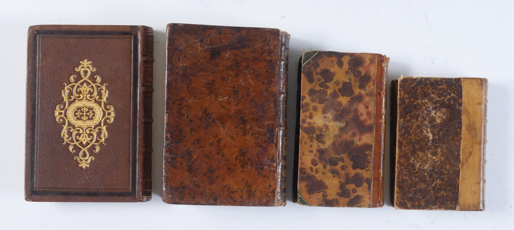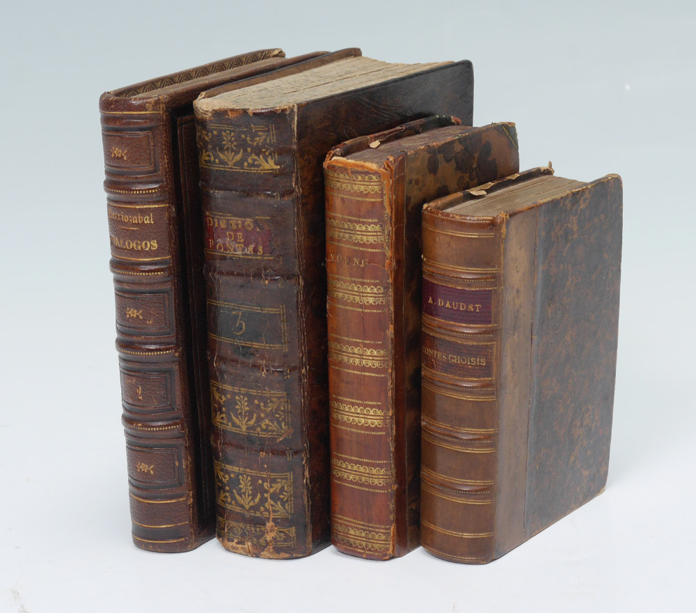 4 ANTIQUARIAN LEATHER BOUND BOOKS: 4 volumes total to include 1) ''Contes Choisis'' by Alphonse Daudet, published 1894 Paris, 4 1/4'' x 3 1/4''. 2) ''Night Thoughts on Life, Death, and Immortality'' by Edward Young L.L.D., published 1807 London. 5'' x 3''. 3) ''Compendio do Diccionario dos Caso de Consciencia de Pontas'', by Father Joaquim do Rosario, published 1794 Lisbon. 5 3/4'' x 4''. 4) ''Dialogos Sobre los Ninos del Antiguo y Nuevo Testamento'', published Madrid 1862, 5 7/8'' x 4 1/8''.