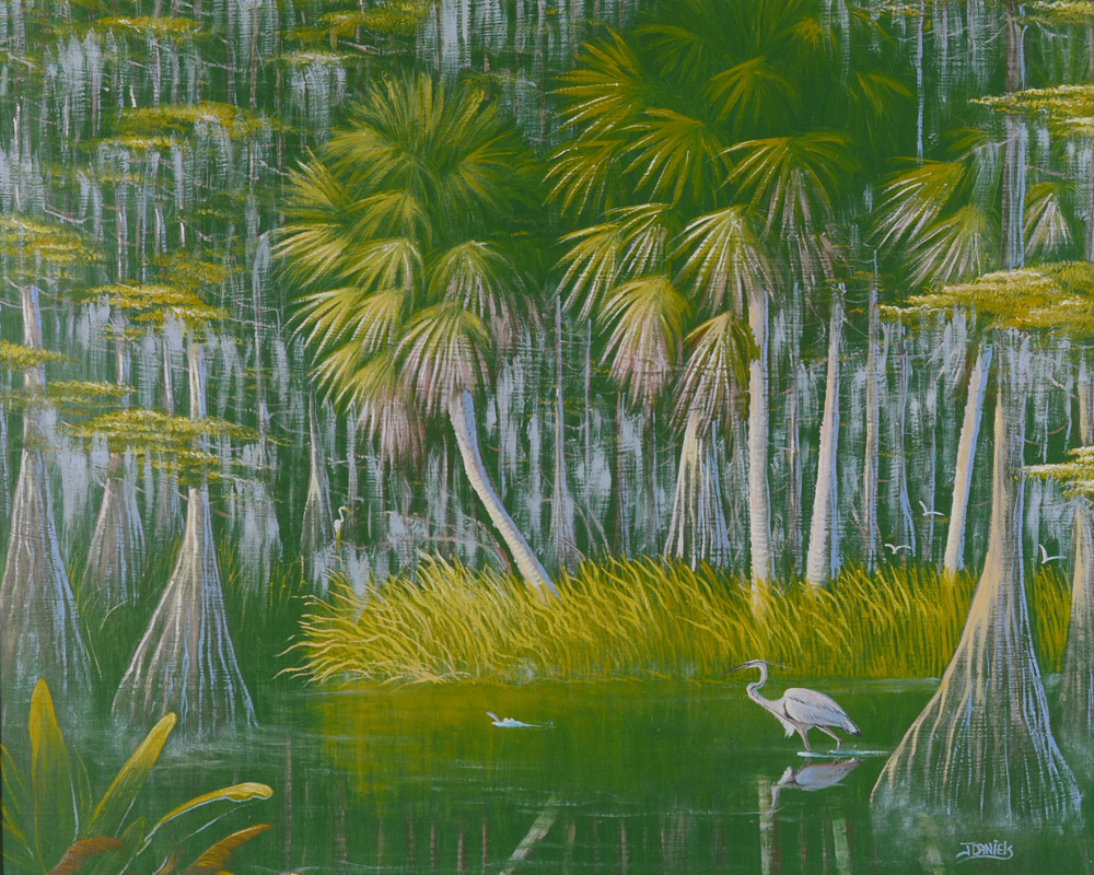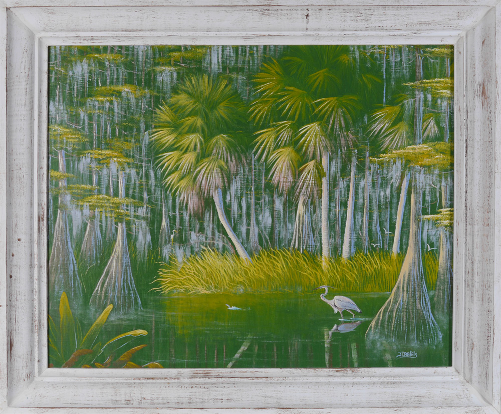 DANIELS, Johnny, (American, 20th Century): Florida Highwaymen swamp scene with cypress and palm trees, Oil/Masonite, signed lower right, 24'' x 30'', molding frame 29 1/4'' x 35''.
