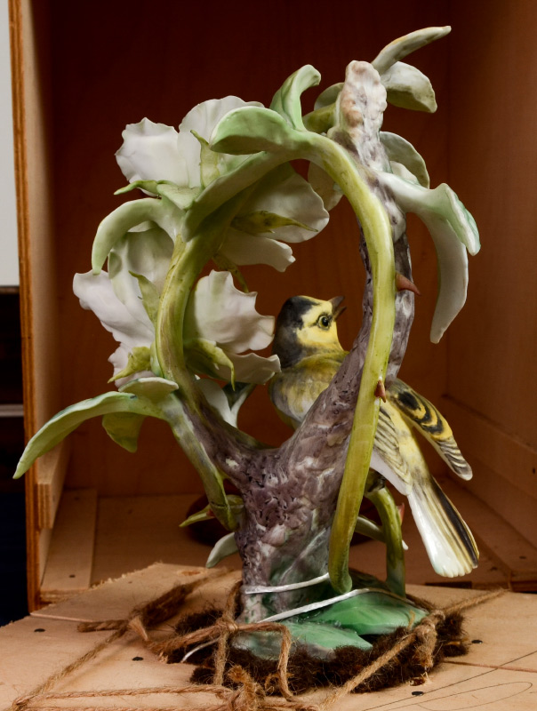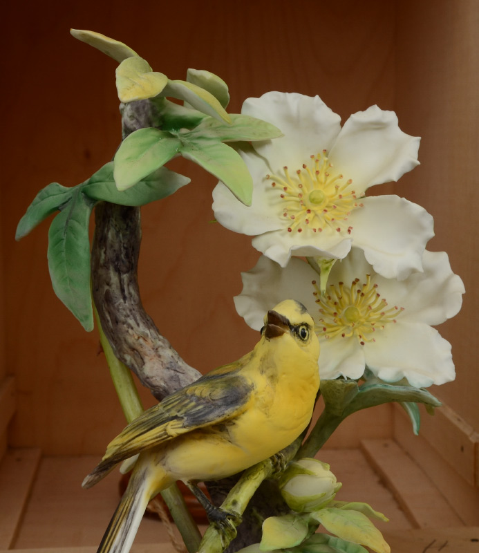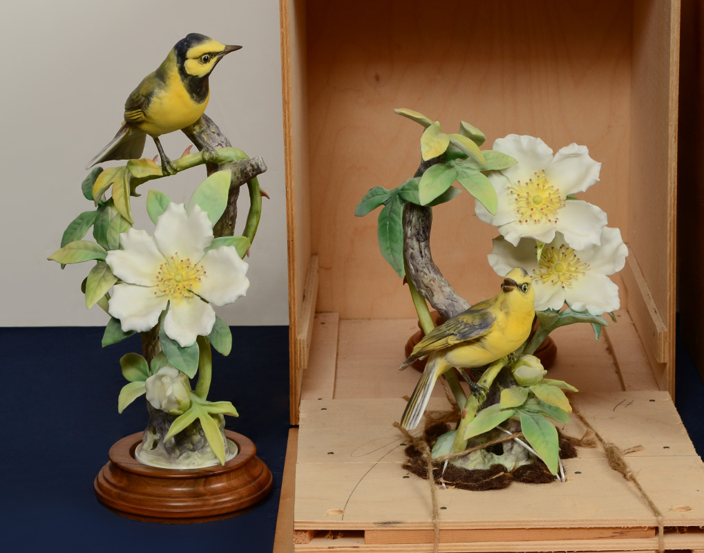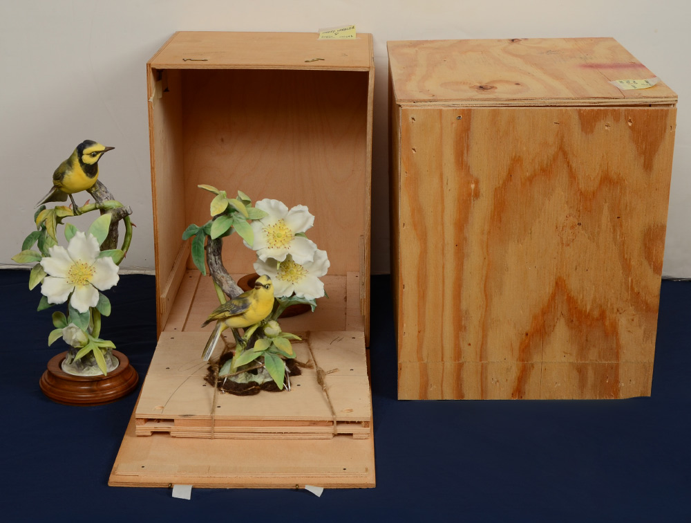 PAIR OF DOROTHY DOUGHTY PORCELAIN BIRD FIGURES: Hooded Warbler hen & cock, each standing on flowering branches. Larger of the 2 measures 11'' h. x 6'' x 7 3/4''. Includes custom boxes and stands for transportation. Box for male is 14 3/4'' h. x 15'' x 12 1/2''. Box for female is 14 1/2'' h. x 11'' x 11 1/4''.
