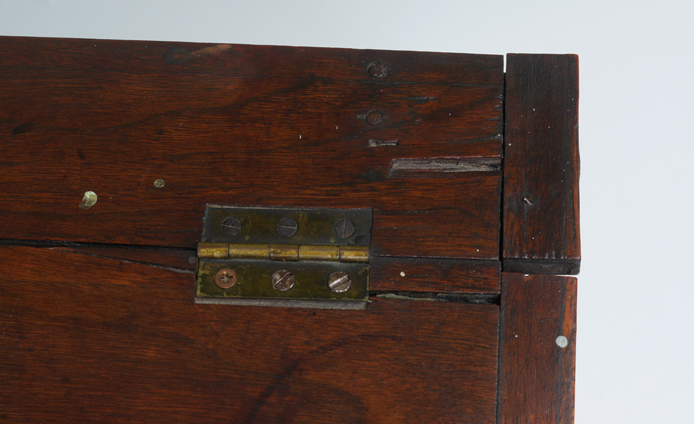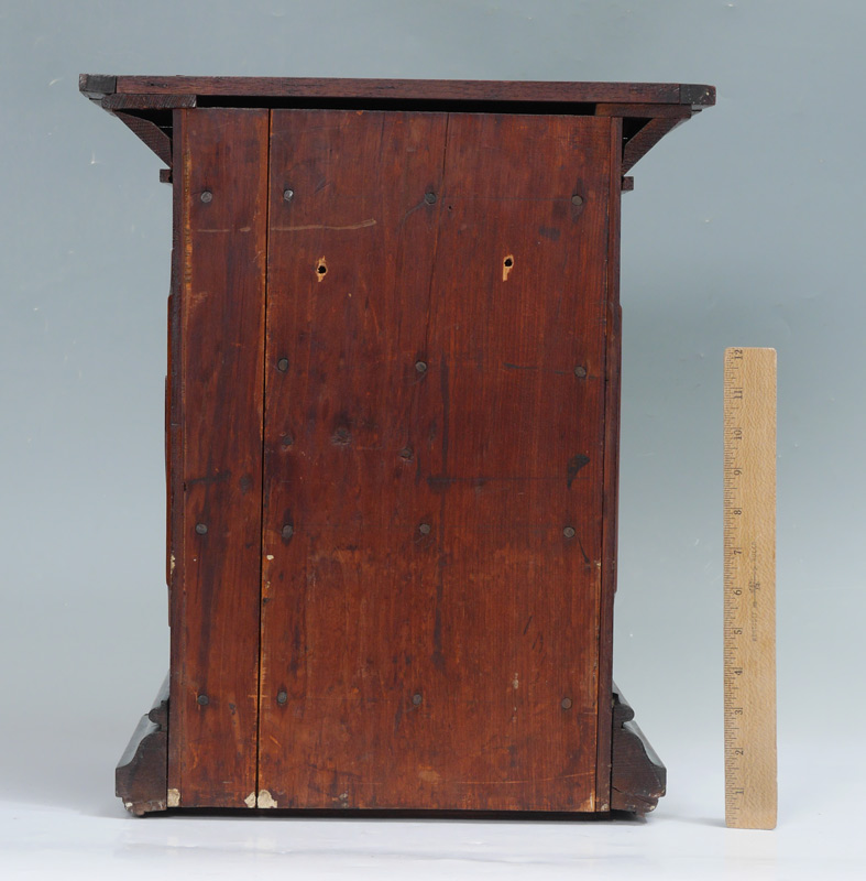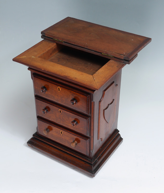 DIMINUTIVE CHEST OF DRAWERS: Canted top with hinged lid, opens to small storage area, over 3 drawers with inlaid escutcheons. Overall measures 18 3/4'' h. x 16'' x 10 3/4''.
