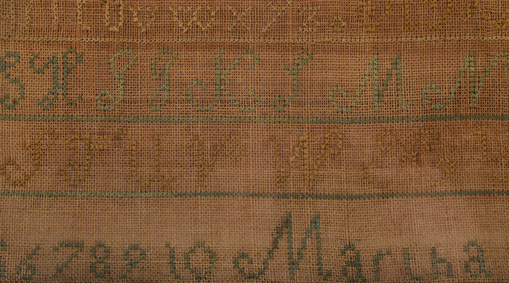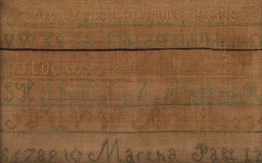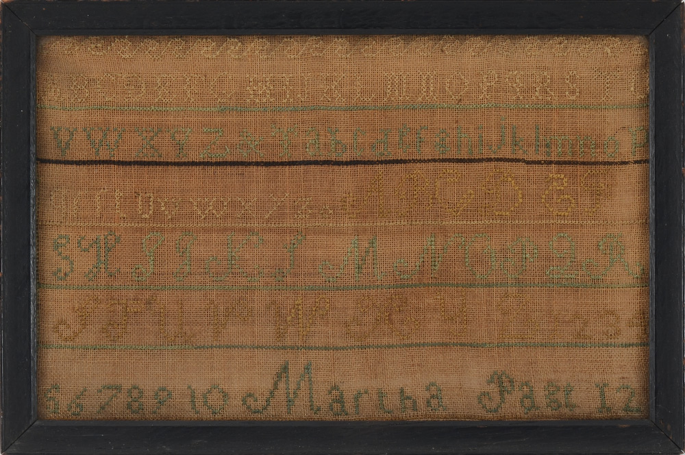HAND SEWN SAMPLER 1832: Worked by Martha Page 12. Repeating alphabet and numerals. Hand written note on back states ''By Martha Mal*** Page Born 1820''. Framed under glass, measures 9 1/2'' x 13 7/8''.