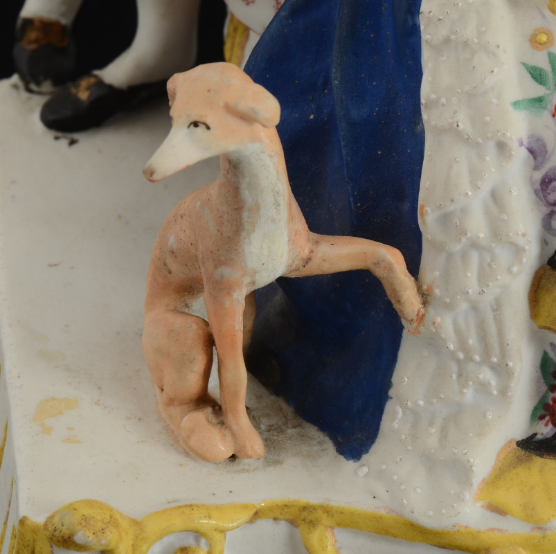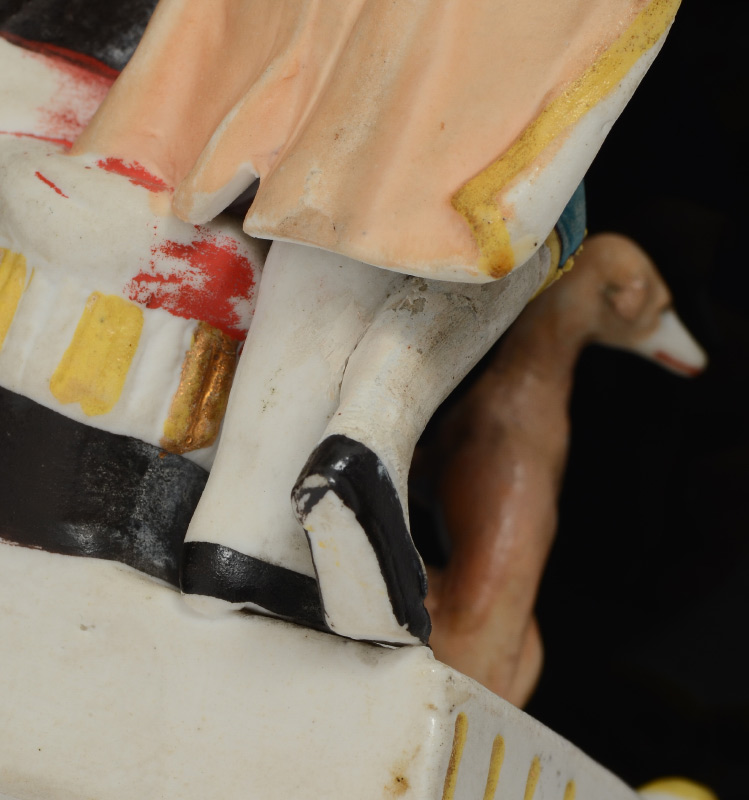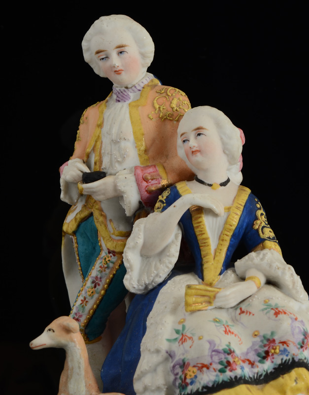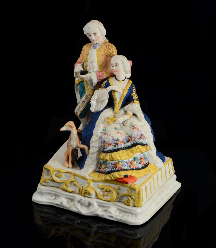 BISQUE FIGURAL INKWELL: Lid with figures of man, woman and a dog. Base with 2 reservoirs with incised masquerons, marked 3.157. Overall measures 7 1/2'' h. x 5 3/4'' x 5''.