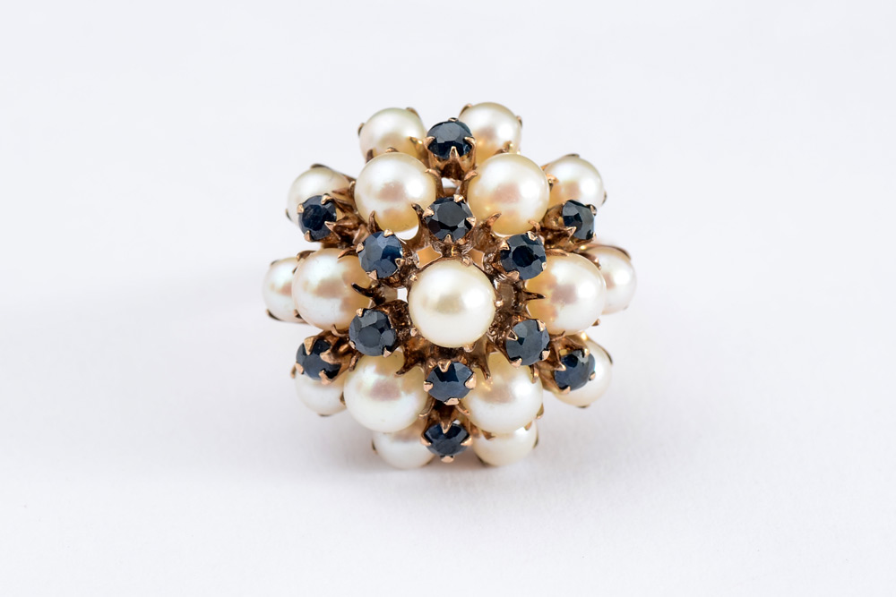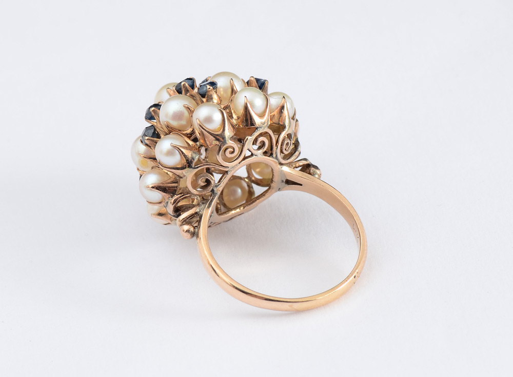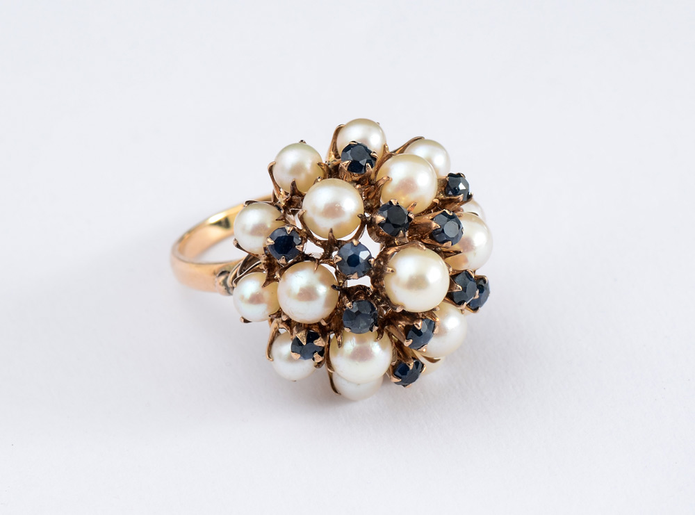 PEARL & SAPPHIRE RING: 14K yellow gold ring contains 17 4.00-4.50 mm cultured pearls. Cream in color. Low/medium luster. Interspersed are 12 round faceted sapphires totaling approx. .50 Ct. The sapphires are prong set. The pearls are peg and epoxy set. Gold Weight: 5.0 grams approx.