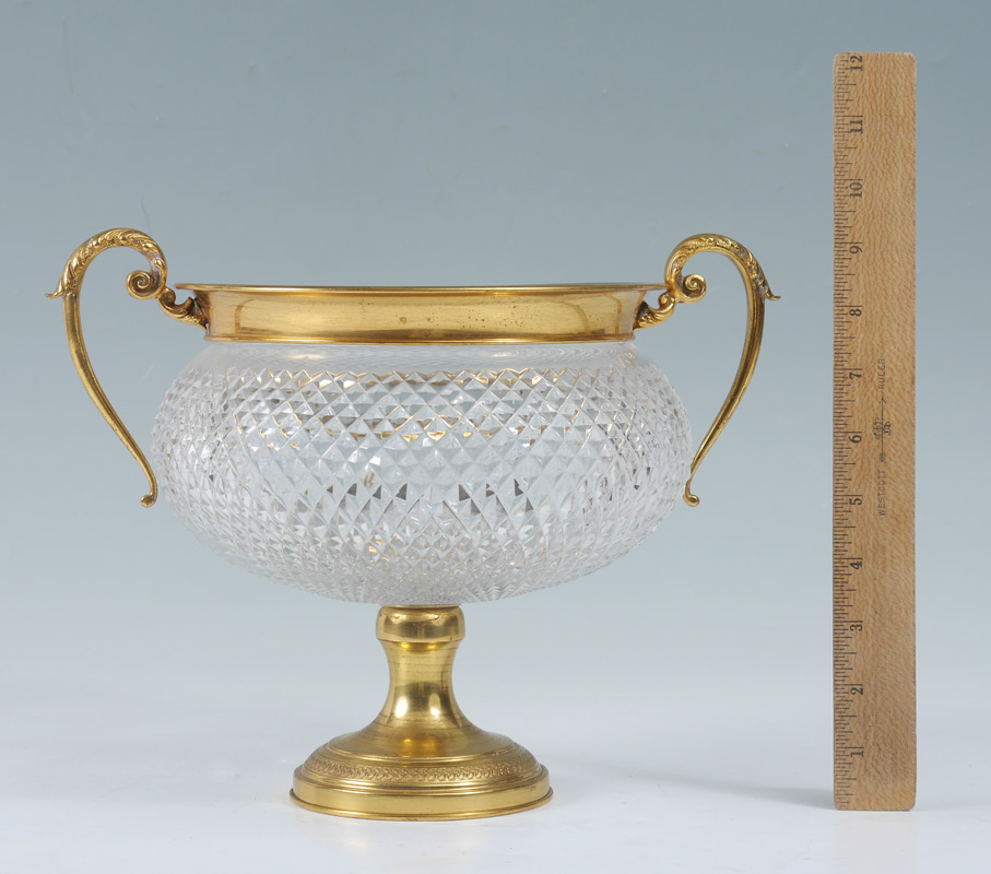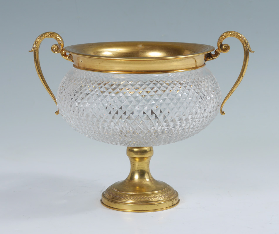 BACCARAT QUALITY BRASS & GLASS CENTER BOWL: Gilt brass mounted cut glass double handled bowl, no visible mark. Measures 9 1/4'' h. x 12''.