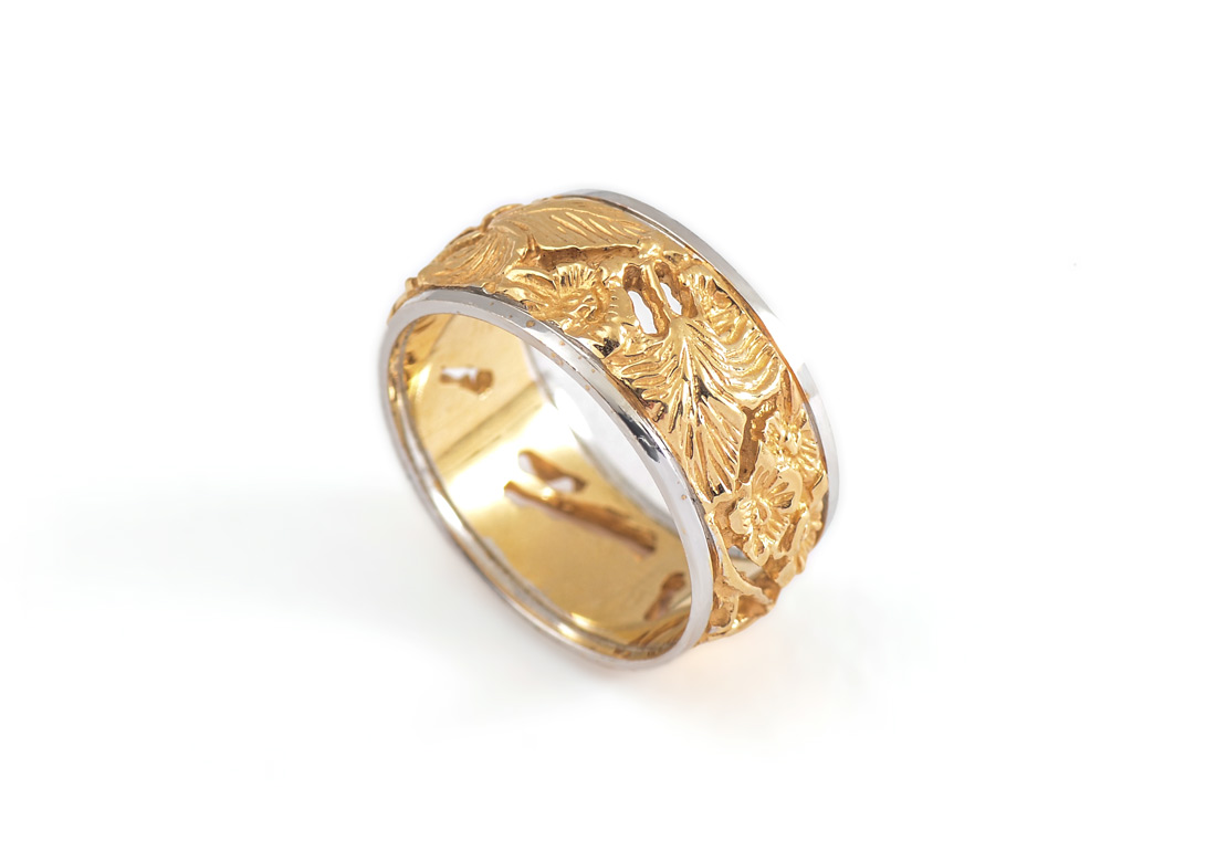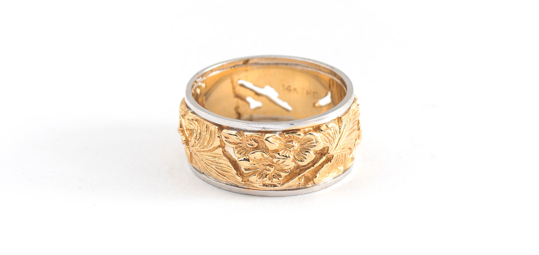 ART NOUVEAU STYLE TWO TONE WEDDING BAND: 14K yellow with white gold. Nouveau style floral cut-out design. Weight: 5.8 grams. Size: 6