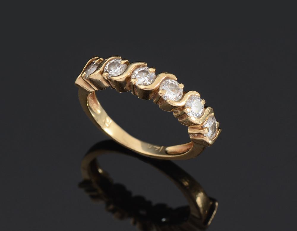 DIAMOND WEDDING BAND: 14K yellow gold ring contains 6 round brilliant cut diamonds. Weight: 1.00 Ct. Approx. Rated VS-SI in clarity and H-I in color. The diamonds are prong set. Weight: 4.0 grams. Size: 6.5