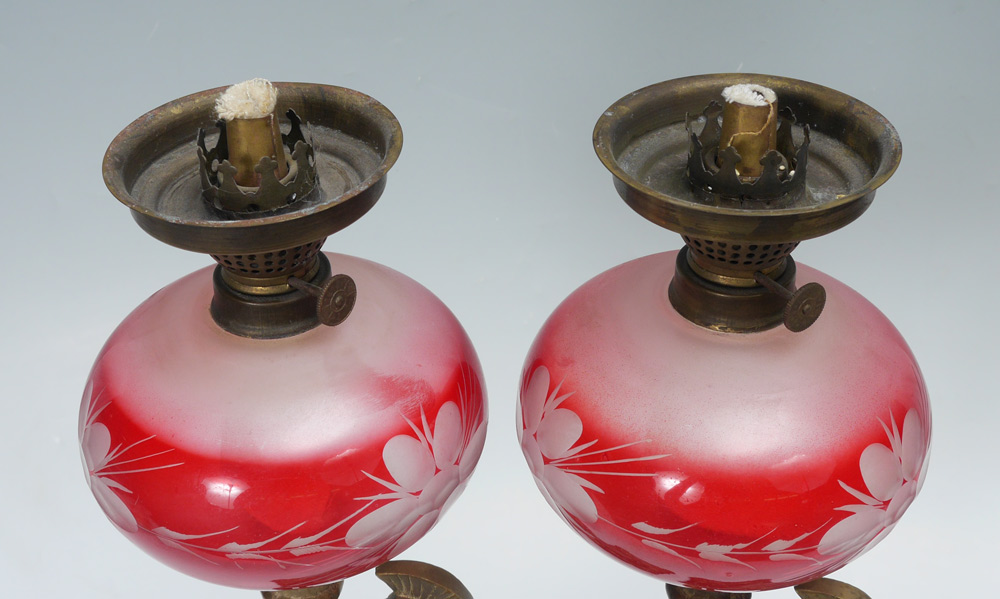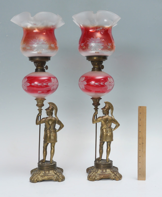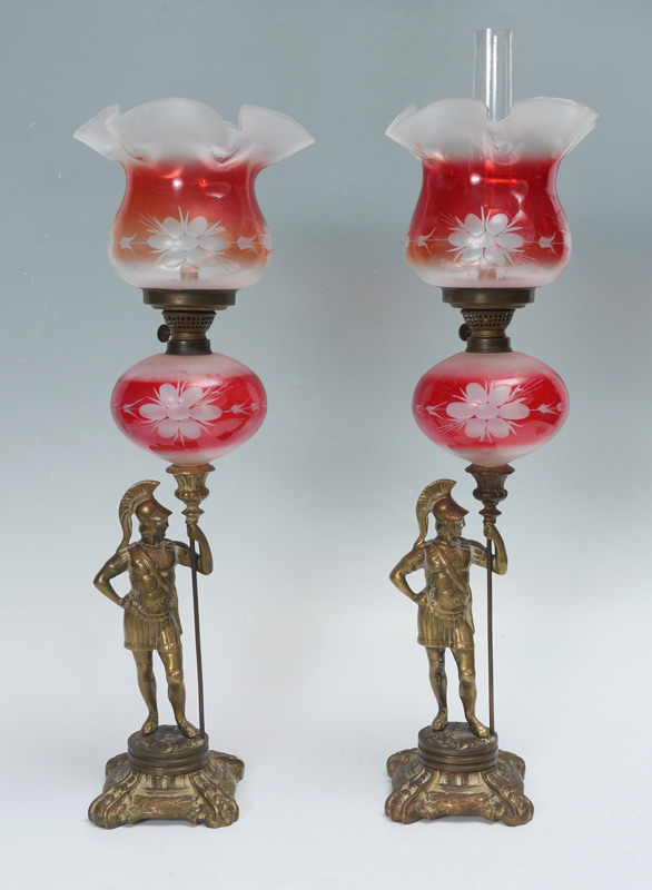 PAIR GILT FIGURAL ROMAN SOLDIER OIL LAMPS: Figure gilt decorated bases in the form of Roman soldiers. Flashed cranberry glass reservoirs and ruffled shades, not converted. Overall with shades measures 29'' h. to top of glass chimney x 9''.