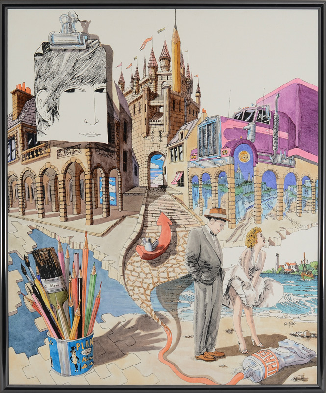 YVES ASKET SURREAL PAINTING TRIBUTE TO LENNON: Pen/Ink/Watercolor and Oil, 24'' x 20'', signed lower right, framed, 25'' x 21''.