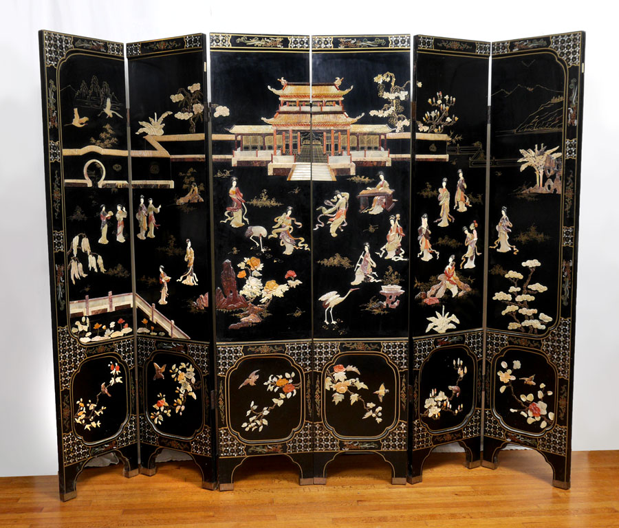 6 PANEL CHINESE COROMANDEL SCREEN: Stone overlay, gilt, polychrome and mother of pearl decorations over black lacquer, outdoor genre scenes with figures. Each panel 78 1/2'' h. x 17''.