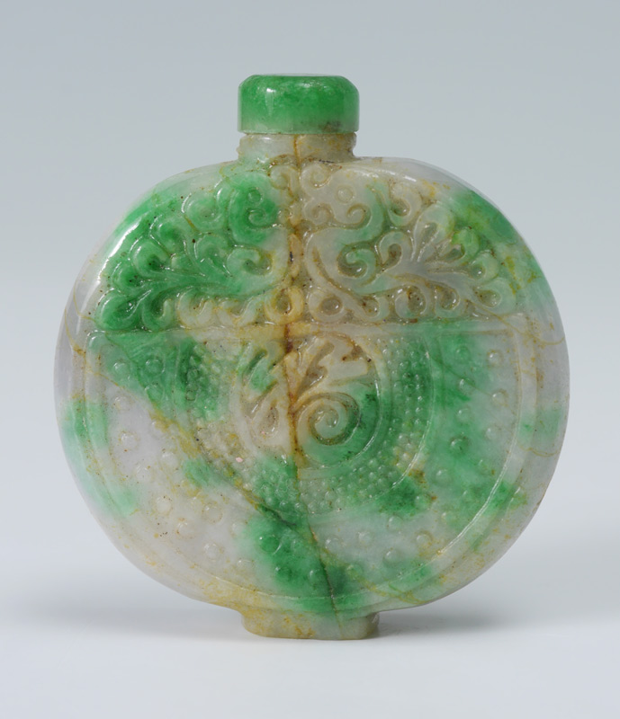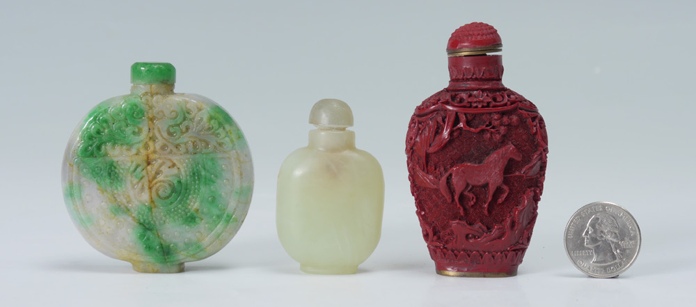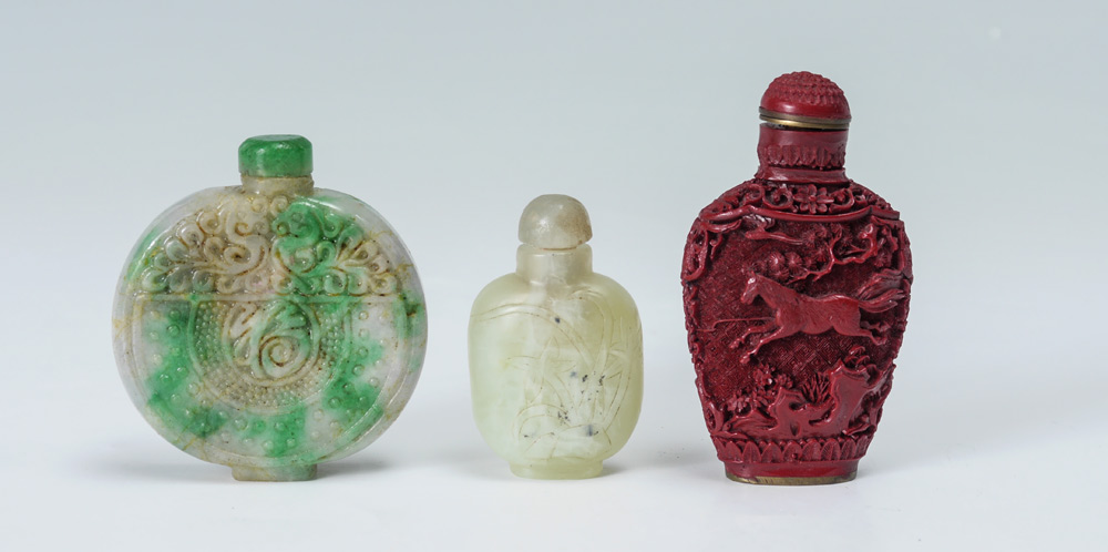 3 PIECE CHINESE SNUFF BOTTLES: An assembled 3 piece collection to include 1) Green and white carved stone round bottle, lid affixed to bottle, 2 3/4'' h. 2) Cinnabar with horse motif, Ching dynasty marks on base, 3 1/4''. 3) Carved light green stone with bamboo motif, 2 1/4''.
