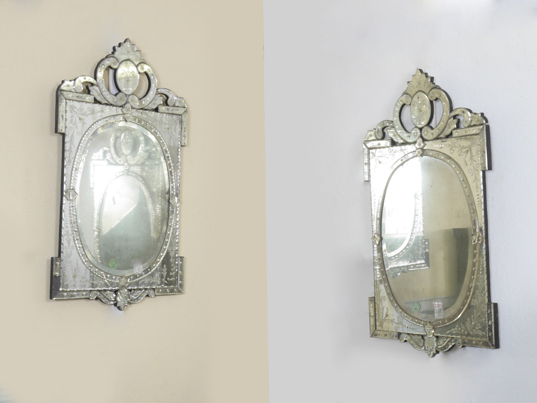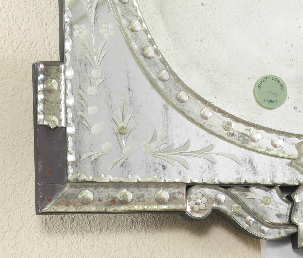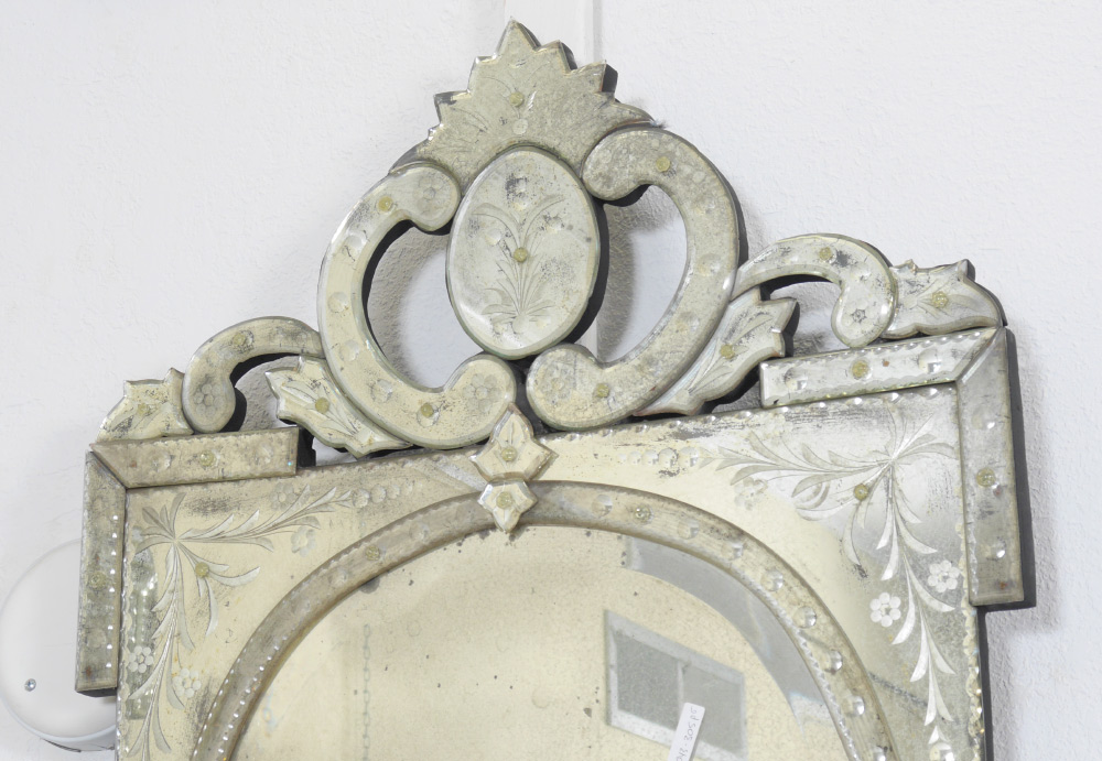PAIR VENETIAN STYLE MIRRORS: Contemporary with an antiqued appearance, measures 44'' h. x 24 1/2'' x 1''.