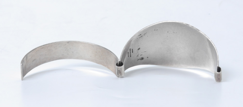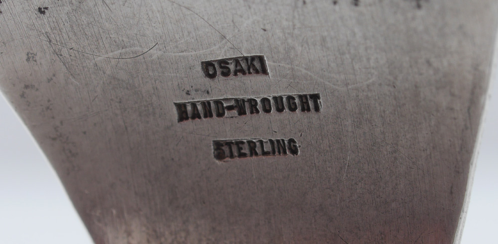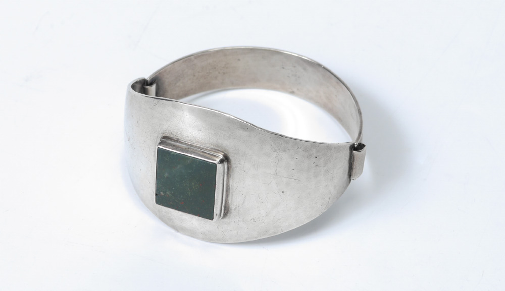 HARRY OSAKI STERLING SILVER BRACELET: Mid Century hand wrought hinged bracelet by noted artist Harry Osaki with square polished stone cabochon, marked inside. 2 1/2'' dia.