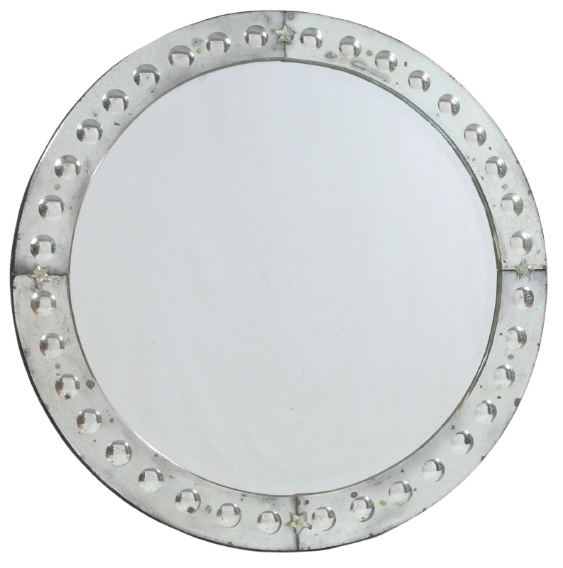 ROUND VENETIAN STYLE MIRROR: Contemporary with an antiqued appearance, bull's-eye border, measures 39 1/2''dia., 1''deep.