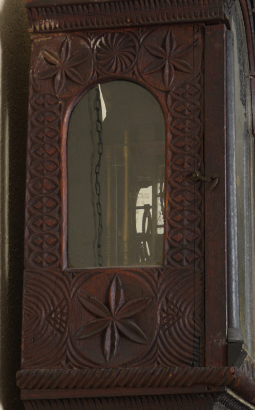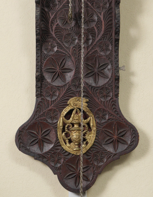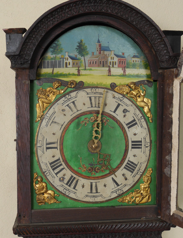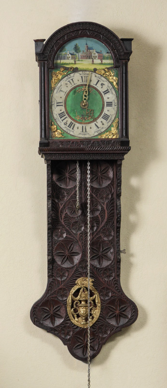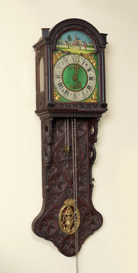 CARVED DUTCH TAIL WALL CLOCK: Carved case with stylized floral motifs, hollow body tail with applied embossed gilt metal decoration. Painted metal dial with outdoor genre scene, Roman and Arabic numerals, applied embossed gilt metal figures. Weight driven time and strike movement. Overall measures 49 1/2'' h. x 14 1/4'' x 8''.