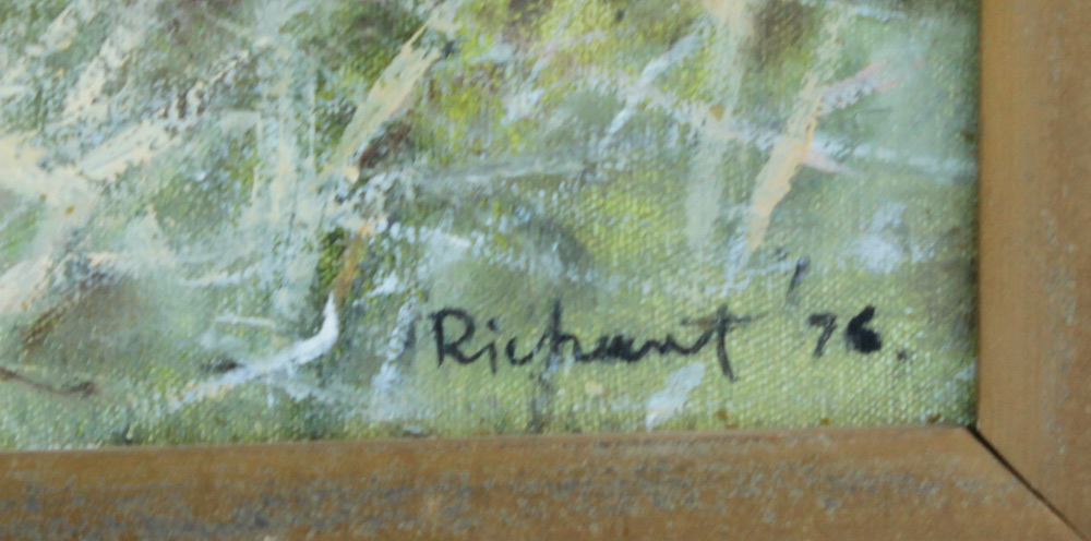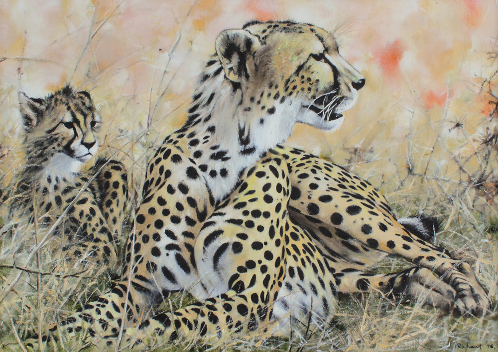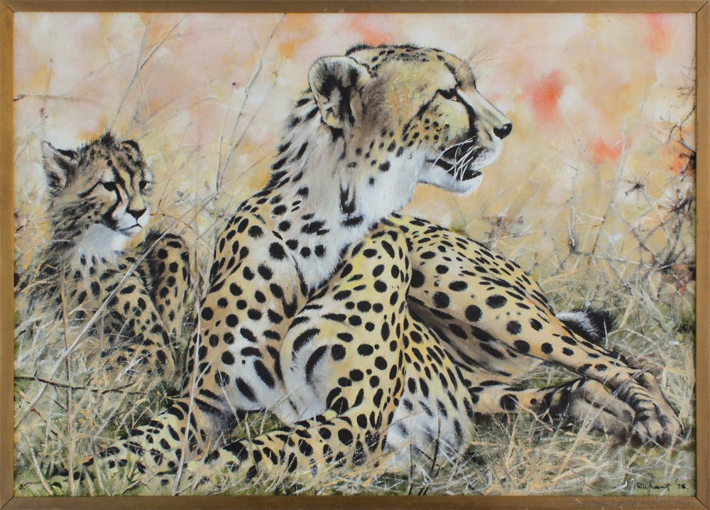 ILLEGIBLY SIGNED S. AFRICAN CHEETAH FAMILY PAINTING: Oil/Canvas, 18 1/2'' x 25 1/2'', signed lower right and dated '76, solid brass framed, 19'' x 26''.