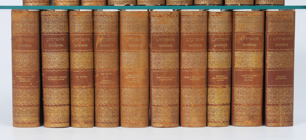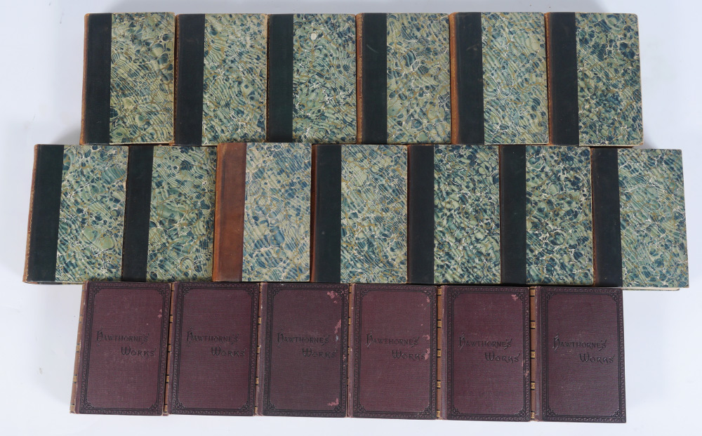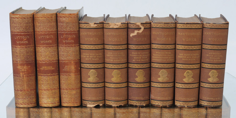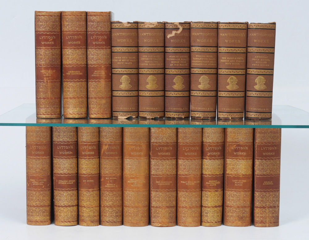 COLLECTION OF HAWTHORNE'S AND LYTTON'S WORKS: Collection of 19 antiquarian books to include 1) 6 volumes Nathaniel Hawthorne's Works, published 1871 by The Riverside Press, Cambridge. Embossed cloth covers. 2) 13 volumes Edward Lytton's Works, published by Thomas Y. Crowell, Boston. Embossed leather spines, with marbled boards.