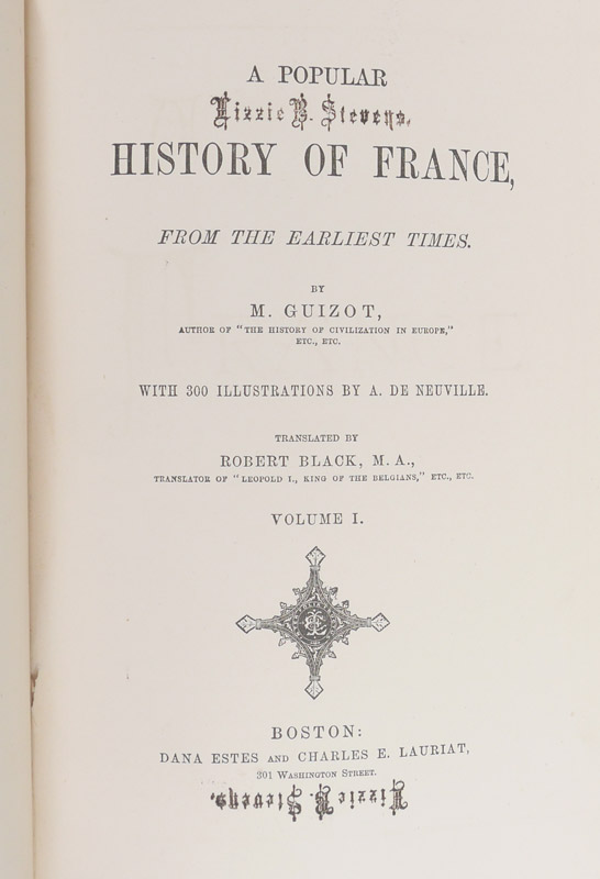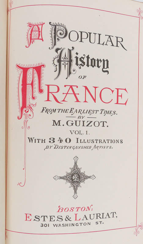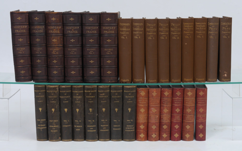 COLLECTION OF ANTIQUARIAN BOOKS: 29 books total to include 1) 6 volumes ''A Popular History of France'' by Francois Guizot, published by Estes & Lauriat, Boston. Quarter leather covers with pebbled boards, red page ends, average size 2 1/2'' x 7 1/2'' x 10''. 2) 8 volumes ''Beacon Lights of History'' by John Lord, published 1883,Fords, Howard and Hulbert, New York, quarter leather covers with stone appearance boards 1 3/4'' x 8'' x 6''. 3) 6 volumes Washington Irving's works, published Thomas Y Crowell & Co., New York, leather spines, marbled boards and page ends, 1 3/4'' x 7 1/2'' x 5 1/4''. Note Astoria volume bound upside down. 4) 9 volumes William H. Prescott's works, published 1892 J. B. Lippincott Company, Philadelphia, embossed clothe covers, 1 1/2'' x 9'' x 6 1/2''.