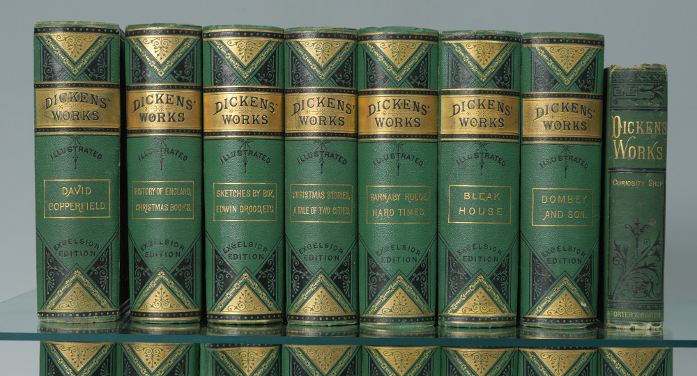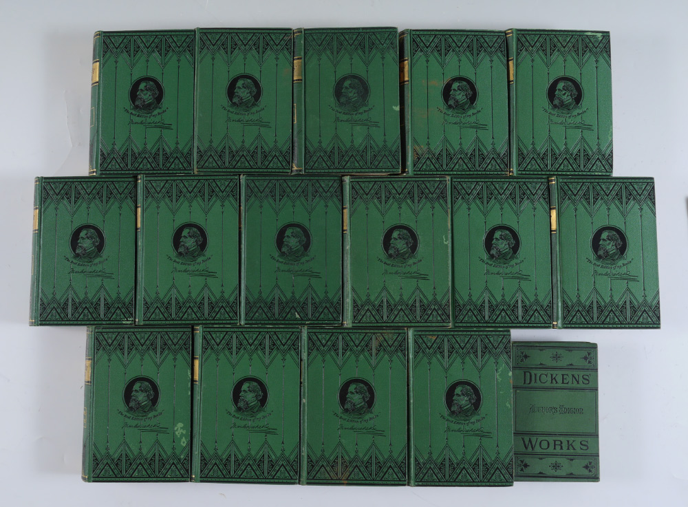 DICKENS, Charles, (English, 1812-1870): Set of 15 volumes, embossed green cloth covers, Excelsior Edition, published in New York by the American News Company. Each volume approx. 8 1/2'' x 6 1/4'' x 2 1/4''. Sold with an additional Authors Edition of ''Curiosity Shop'', publisher in Philadelphia by Porter & Coates.
