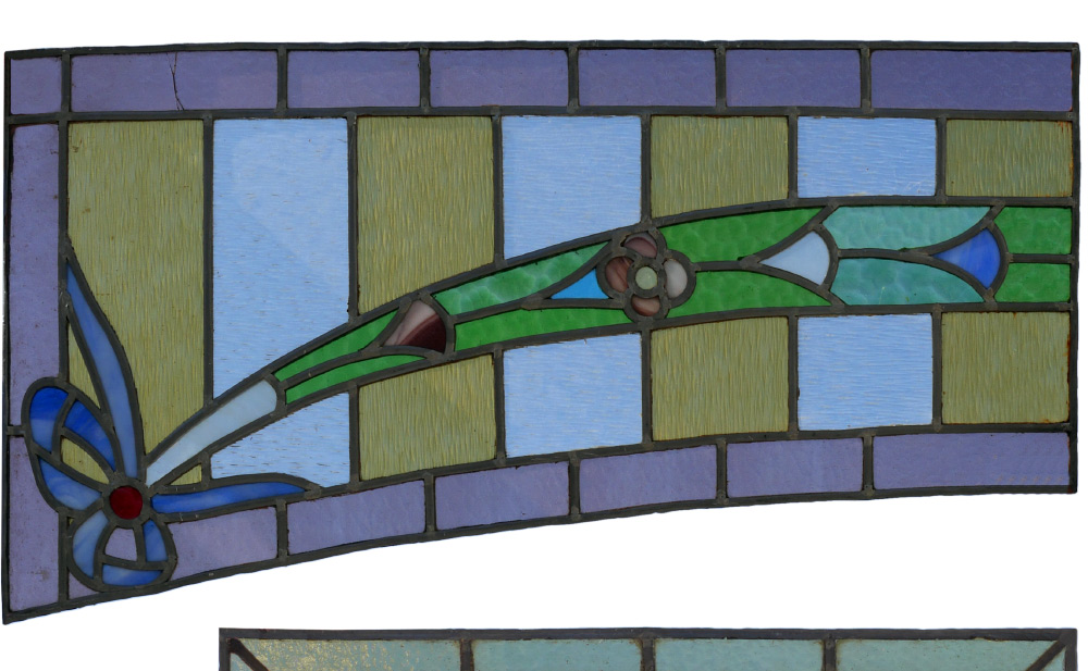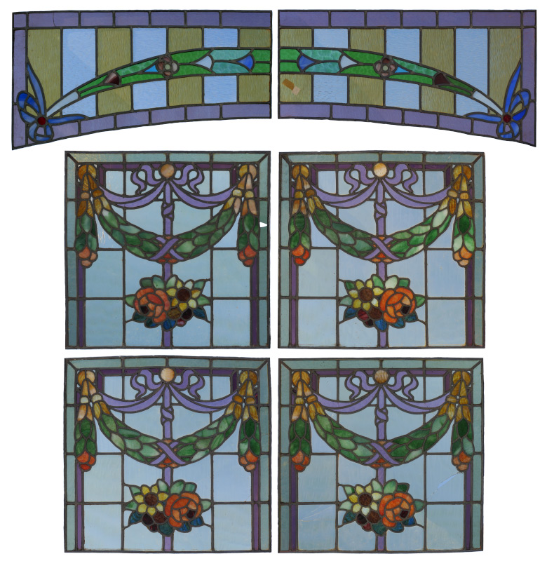 6 LEADED & STAINED GLASS PANELS: 6 panels total 4 with garland swag and floral motifs, assorted glass. Each panel 19'' x 19 3/4'', no frames. 2 with shaped side, 31'' h. x 16'' at bottom.