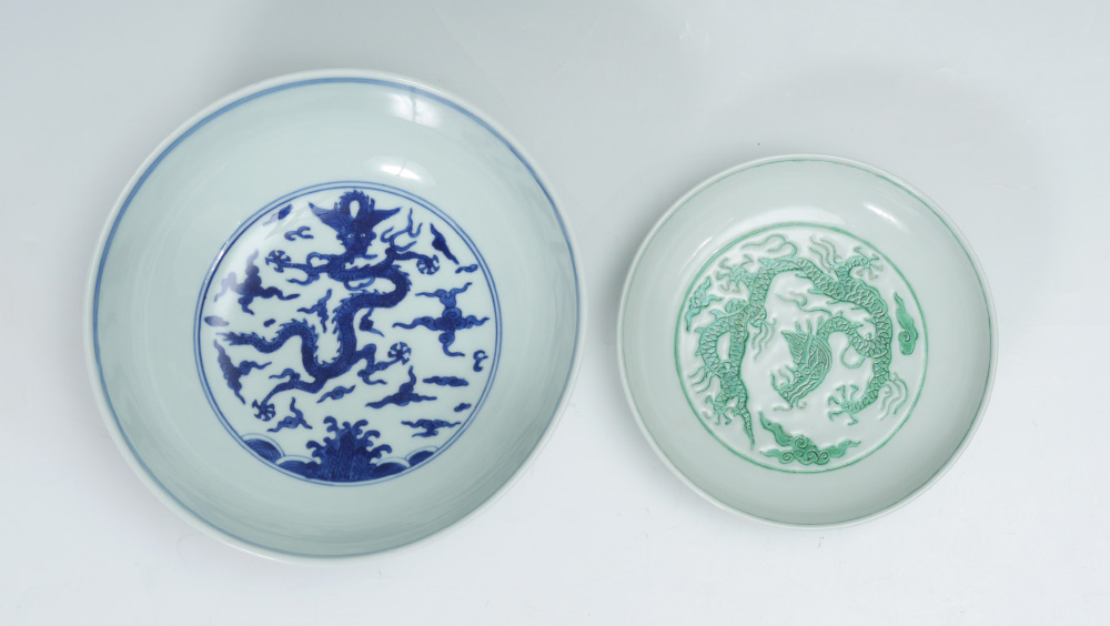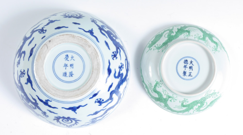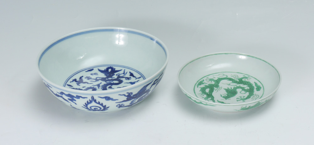 CHINESE GREEN DRAGON & BLUE DECORATED BOWLS: 2 pieces total, both bearing a Zhengde Reign Ming dynasty blue underglaze mark, to include 1) Green incised dragons on inside and out, 1 3/4'' x 7''. 2) Blue & white decorated with dragons inside and out, 3'' h. x 9''. Actual age unknown.
