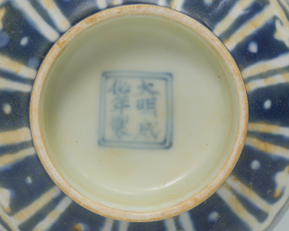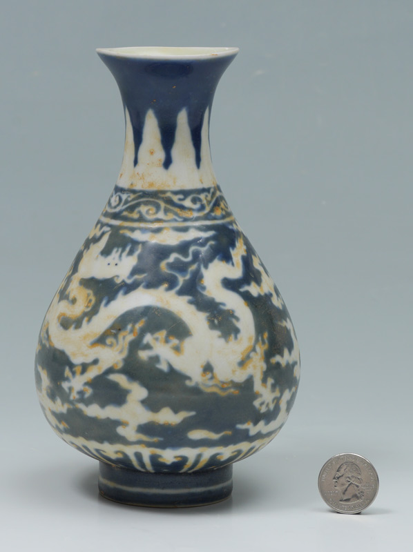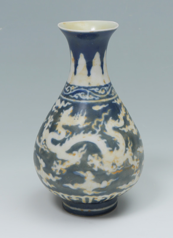 BLUE & WHITE DECORATED CHINESE DRAGON VASE: Blue & white decorated with dragon in clouds motif, bearing Chenghua Reign, Ming Dynasty blue mark. Measures 7'' h. x 4 1/4''. Actual age unknown.