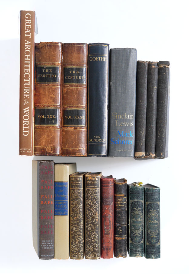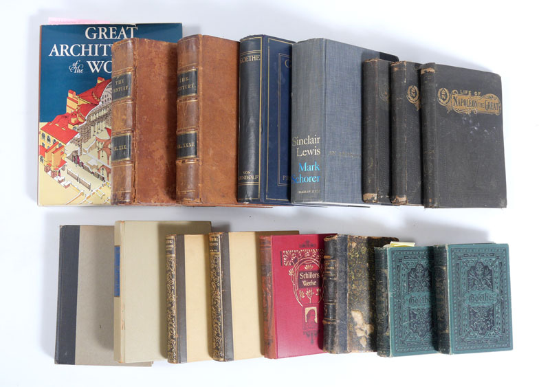 ESTATE COLLECTION OF OLD BOOKS: Titles include 2 Vol. Goethes Werte; Schillers Werke; Toward the Morning, Harvey Allen; 3 Vol. Life of Napoleon the Great; Notre Dame De Paris Vol. 2 by Victor Hugo, 1876; Fail Safe, 1962; Sinclair Lewis, An American Life by Schorer, First Edition; Gothe by Von Gondolf, 1925; 2 Leather Bound ''The Century'' Books 1885-1886 and more. Sold as a lot.