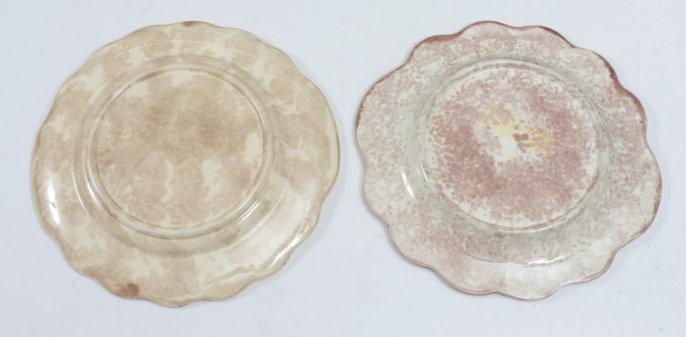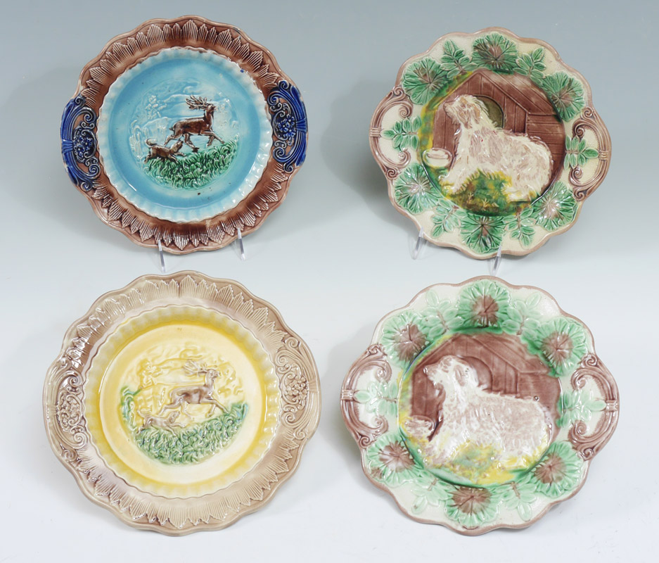 GROUP OF 4 MAJOLICA DOG AND DEER PLATES: 2 each of running deer and dog, and Large dog and house. Scrolled handles, measure approx. 11'' dia.