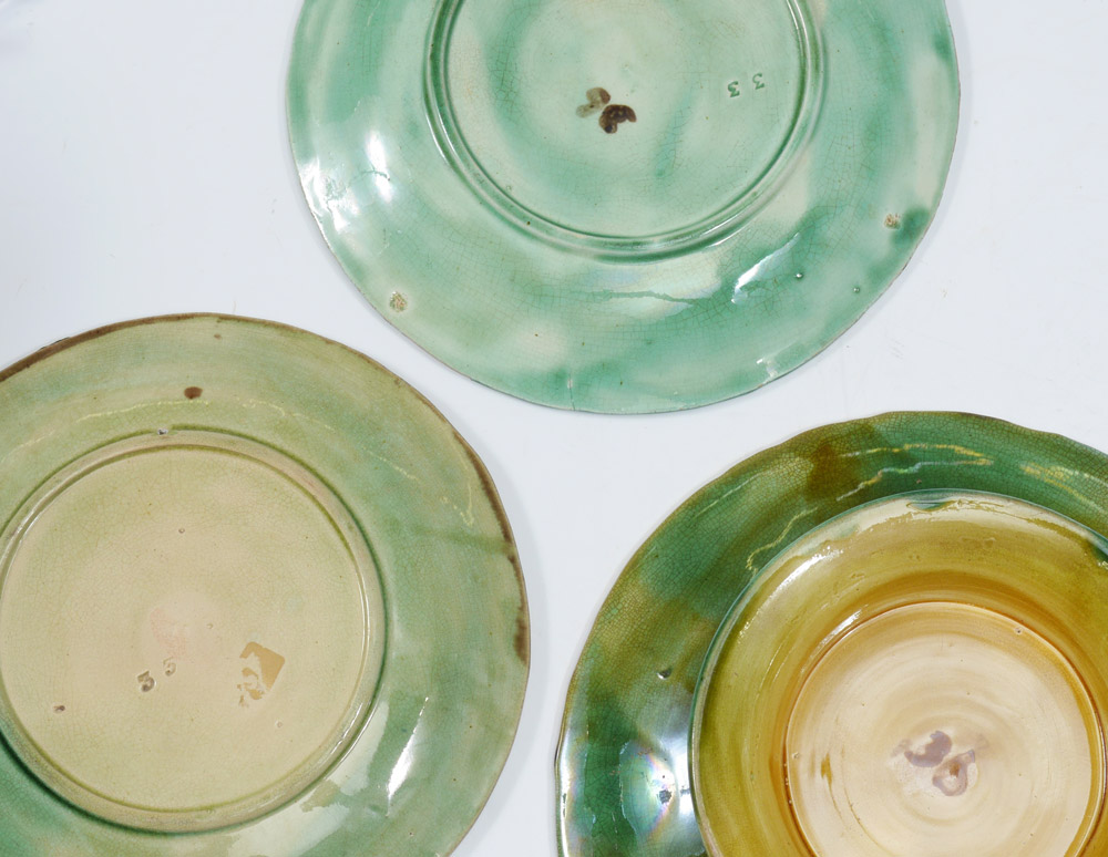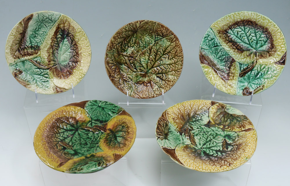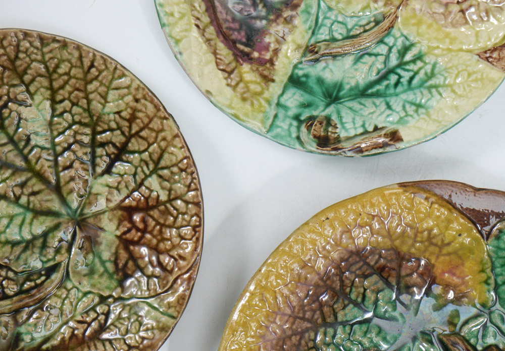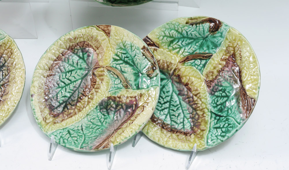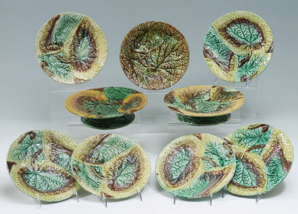 MAJOLICA LEAF DESIGN PLATES AND COMPOTES: Deep crisp leaf design in naturalistic colors. 9 pieces to include 7 plates ( 8 1/2'' dia.), and 2 short pedestal plates ( 2'' tall x 9 1/4'').