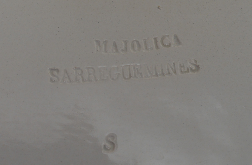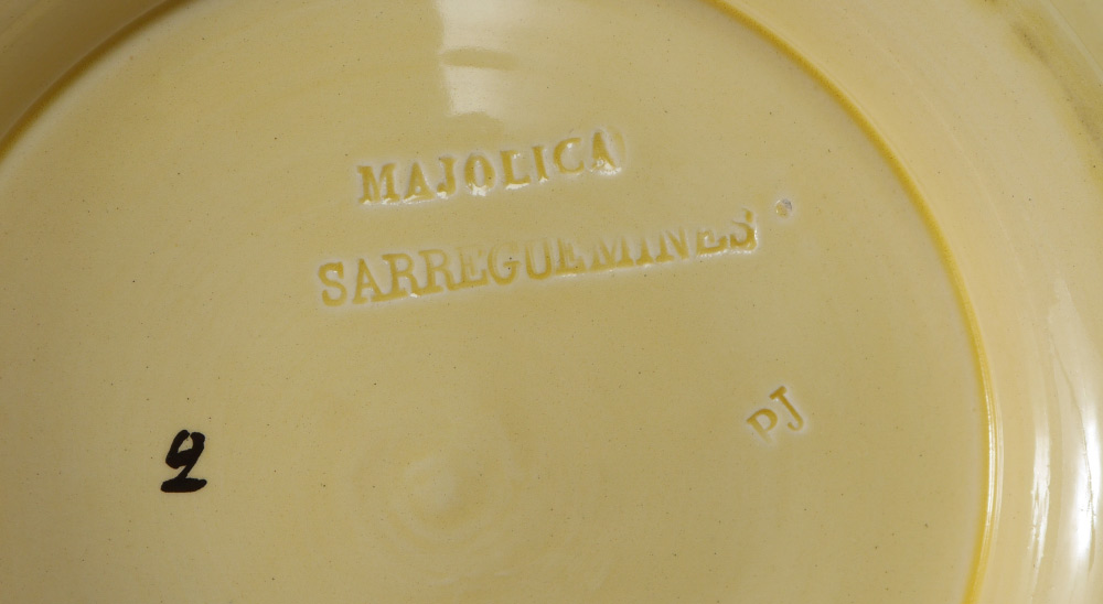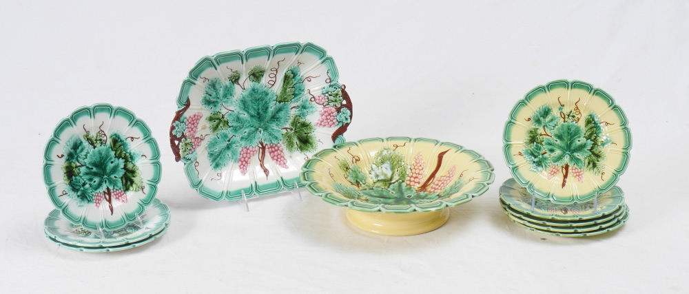 SARREGUEMINES FRENCH MAJOLICA IN A GRAPE LEAF PATTERN: 10 pieces to include the 12'' pedestal bowl, 8 plates (8'' dia.) and a platter ( 12 1/2'' x 9 3/4'').