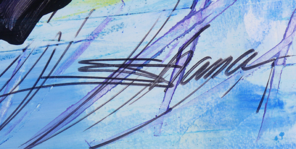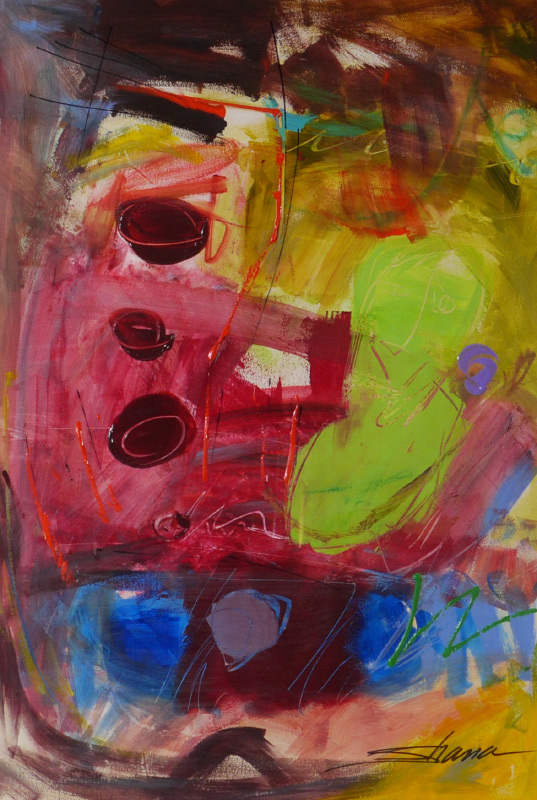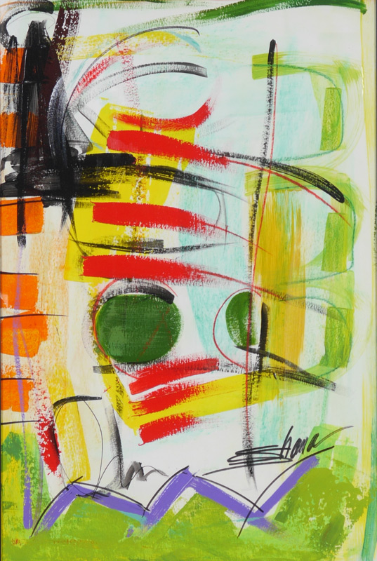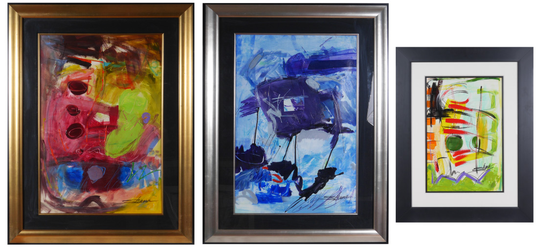 DOMINGUEZ, Shana, (American, 20th Century): 3 Abstract works; 1) Abstract Composition, Mixed Media on Board, sight size 35'' x 23'', signed lower right, ebonized and gold gilt frame, 48'' x 36''; 2) Abstract Composition in Blue, Mixed Media on Board, sight size 35'' x 23'', signed lower right, ebonized and silver gilt frame, 48'' x 36''; 3) Abstract Composition, Mixed Media on Board, sight size 23 1/2'' x 15'', signed lower right, ebonized and gold gilt frame, 36'' x 23 1/2''.